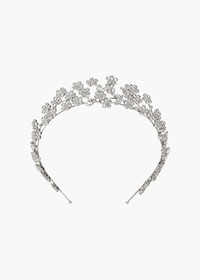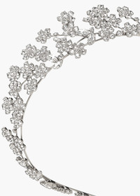 As its moniker suggests, the Meadow Tiara is a poetic composition of flowers, situated to appear carried by the breeze through a meadow. Rendered in fine crystal, our classic floral motif is organically scattered in an asymmetrical arrangement, with regal height and curved shape that is flattering on every face. Made by hand in New York, it sits on a flexible wire base, for comfortable yet secure placement in the hair. Pair with the matching Violet Stud Earrings . Material The Meadow Tiara is made in New York of 18K gold or rhodium plated brass and crystals. We recommend treating this tiara as you would a piece of jewelry, and storing in the dust bag when not in use. Avoid contact with water, perfume, and other chemicals, including hairspray, which should be used before placement in the hair.