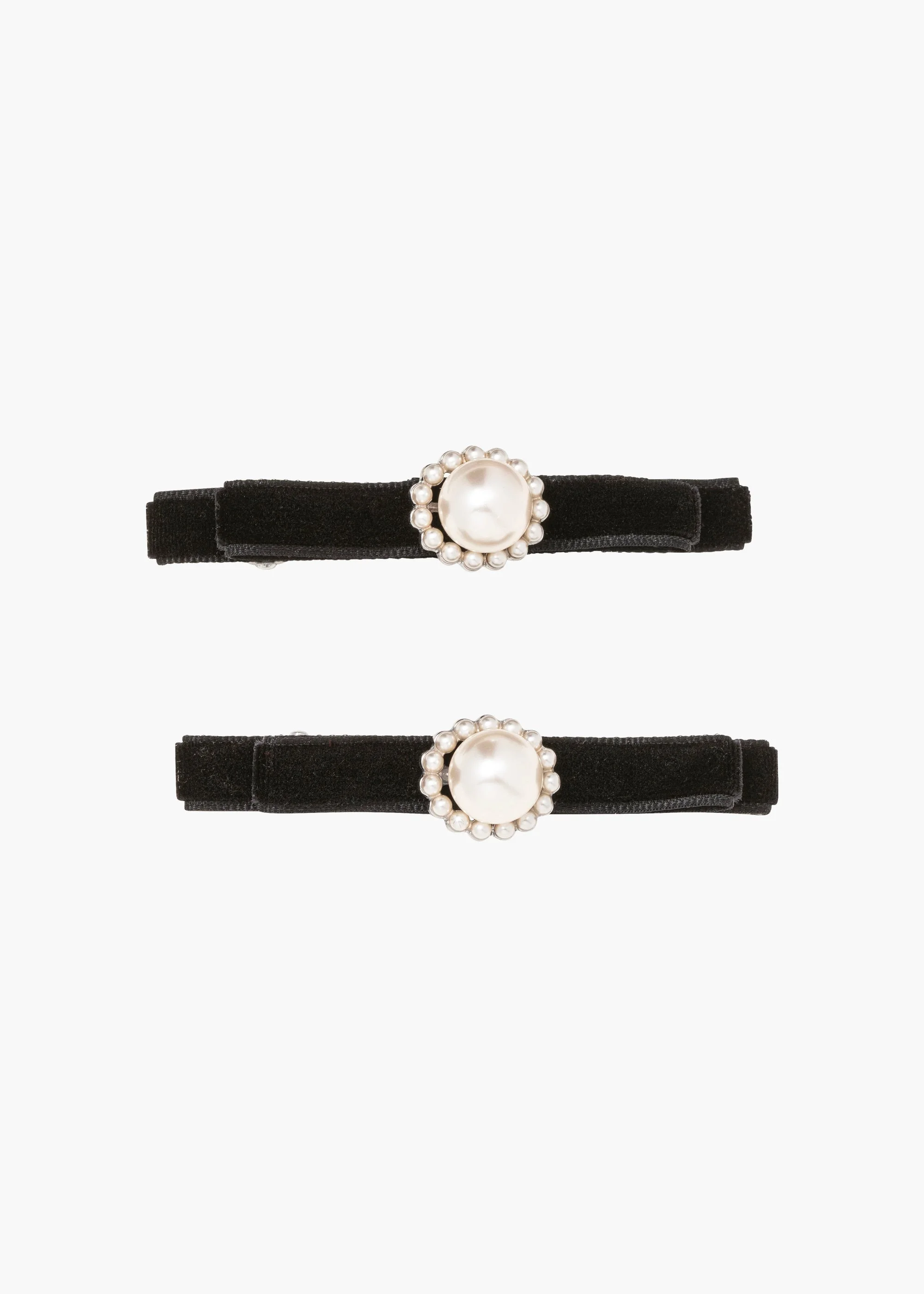 Material The Minetta Bow Clips are made by hand of velvet ribbon with a gold plated brass Austrian crystal pearl accent, finished on a steel alligator clip base. We recommend treating this clip as you would a piece of jewelry, and storing in the dust bag when not in use. Avoid contact with water, perfume, and other chemicals, including hairspray, which should be used before placement in the hair. Imported.
