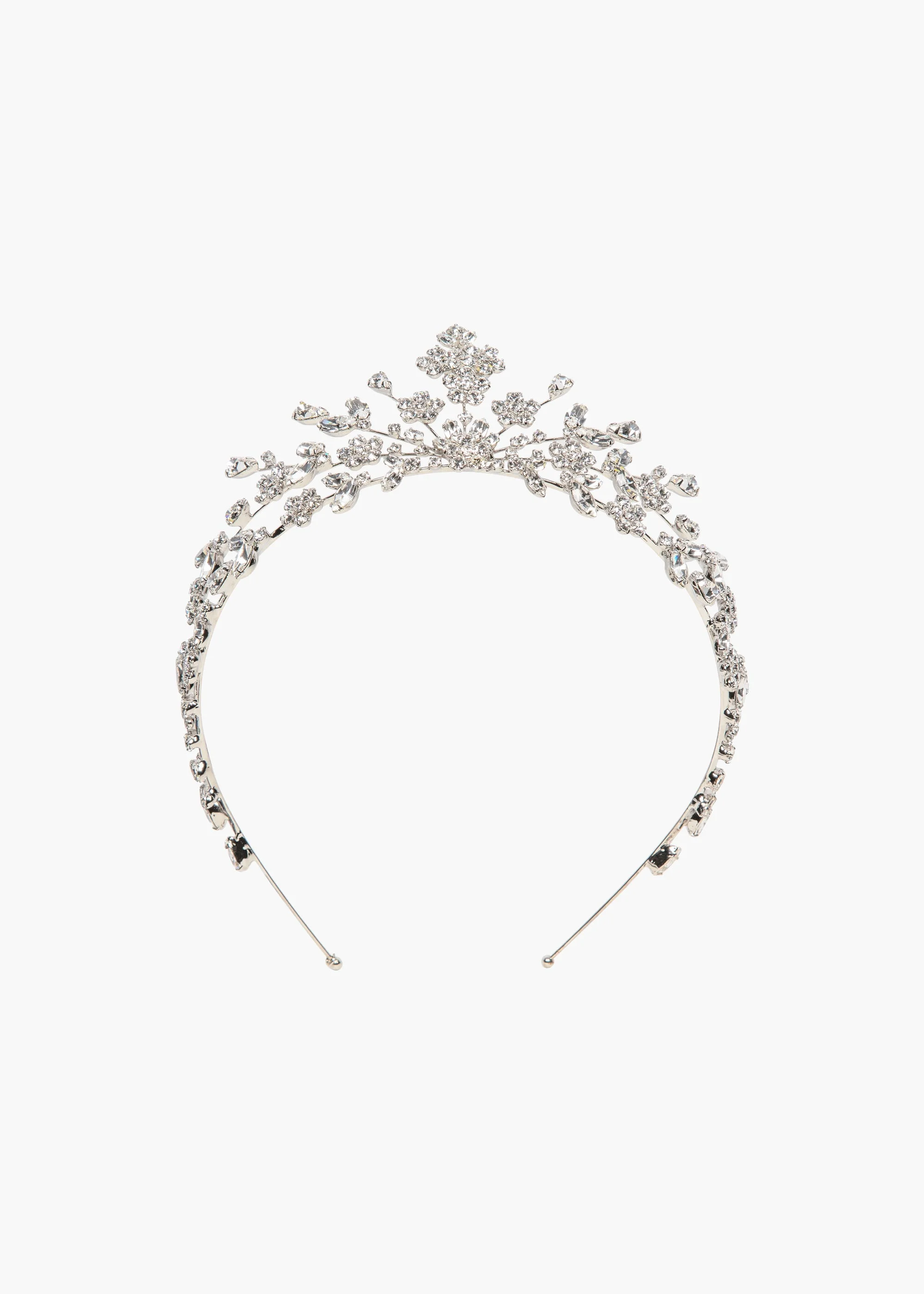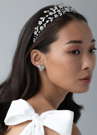 A triumph of design, the Miriam Tiara engenders awestruck glances at every turn. Manifested in fine crystal, its floral sprays veer outward like rays of sunshine, brilliantly arranged to create a memorable finished look. Its flexible base means this headpiece is secure and comfortable to wear with hair up, down, or anywhere in between. Pair with the matching Violet Stud Earrings . Material The Miriam Tiara is made in New York of 18K gold or rhodium plated brass and crystals. We recommend treating this tiara as you would a piece of jewelry, and storing in the dust bag when not in use. Avoid contact with water, perfume, and other chemicals, including hairspray, which should be used before placement in the hair.