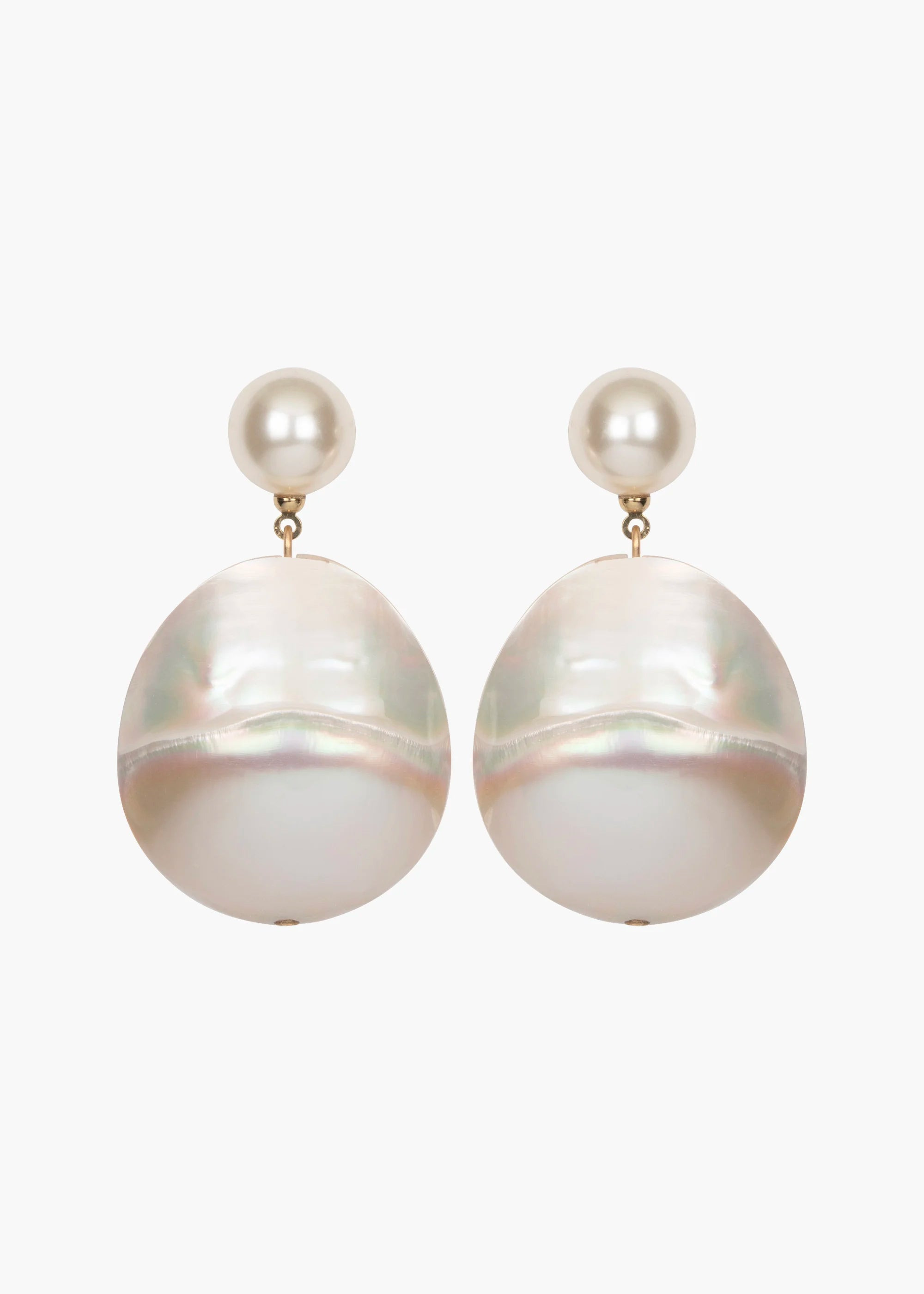 Mother of pearl is a material integral to the Jennifer Behr brand, and the Nerine Earrings draw on its magic in a novel way, finding the organic element in its natural state. The oversized mother of pearl drops are handmade and designed to refract a kaleidoscope of iridescent hues from every angle. Suspended from our classic crystal pearl, these earrings are exceptionally lightweight despite their monumental size. Dimensions: 2 inch length Material The Nerine Earrings are made by hand in New York from Czech crystal pearls and handmade mother of pearl beads. All beads have natural variances in color and markings that make each one unique. They have a surgical-steel post, are nickel-free and safe for sensitive skin. We recommend storing earrings in their dust bag while not in use, and avoiding contact with water, perfume, hairspray, and other chemicals.
