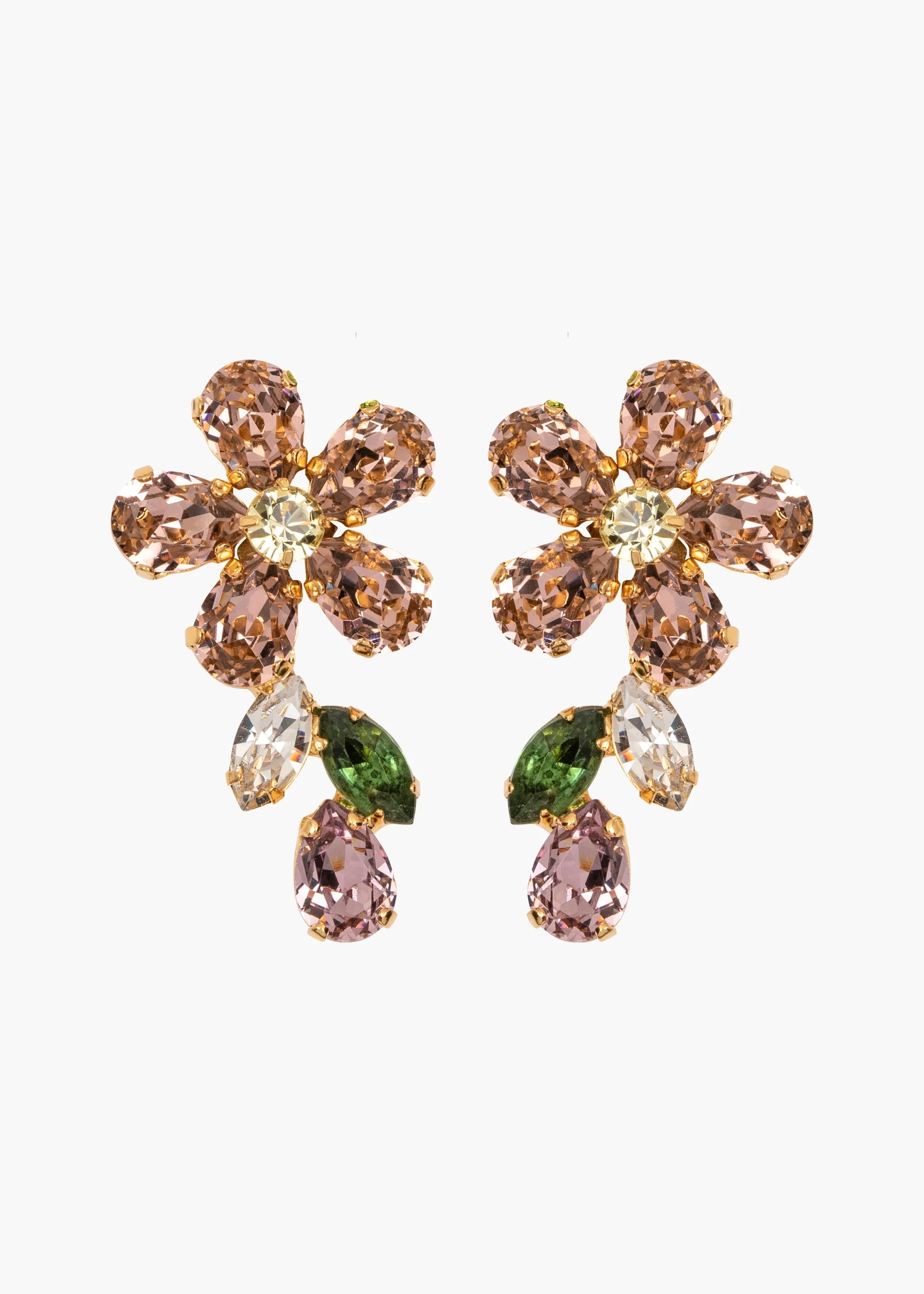 An addition to our iconic collection of crystal flower earrings, the Odelia Earrings have the richly vivid palette of an Impressionist painting. Austrian crystals in an imaginative range of colors and cuts are lodged in an 18-karat gold-plated setting. Made by hand in New York, the placement of each individual stone is carefully considered in the design process, for a finished look that frames the face. Material The Odelia Earrings are made by hand in New York from Austrian crystals and 18k gold plated brass. They have a surgical-steel post, are nickel-free and safe for sensitive skin. We recommend storing earrings in their dust bag while not in use, and avoiding contact with water, perfume, hairspray, and other chemicals.