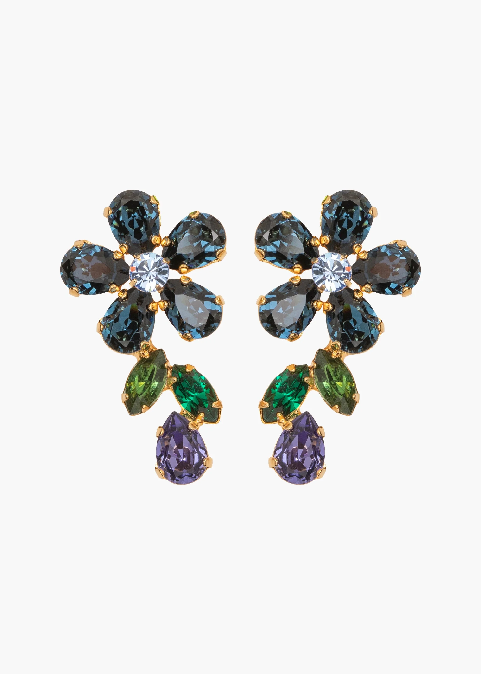 An addition to our iconic collection of crystal flower earrings, the Odelia Earrings have the richly vivid palette of an Impressionist painting. Austrian crystals in an imaginative range of colors and cuts are lodged in an 18-karat gold-plated setting. Made by hand in New York, the placement of each individual stone is carefully considered in the design process, for a finished look that frames the face. Material The Odelia Earrings are made by hand in New York from Austrian crystals and 18k gold plated brass. They have a surgical-steel post, are nickel-free and safe for sensitive skin. We recommend storing earrings in their dust bag while not in use, and avoiding contact with water, perfume, hairspray, and other chemicals.