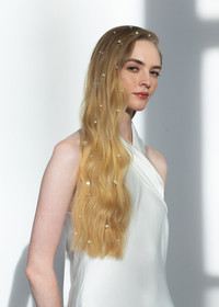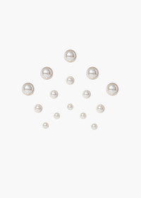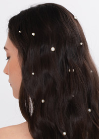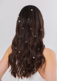The Paige Hair Magnet Set magically manages to create the sublime look of hair dripping with pearls. Made by hand in New York, this set of 15 pieces uniquely employs magnets to secure to any hair type, with pearls on each side of the magnet, so that all you see is their opalescent glow. With stones in a variety of sizes for a sense of depth, this set can be layered with the Kira Hair Magnet Set for a dynamic combination of pearls and crystals. Dimensions: Biggest pearl: 1/8” width, 1/8” height. Medium pearl: 1/16” width, 1/16” height. Smallest Pearl: 1/32” width, 1/32” height. Material The Paige Magnet Set are a set of 15 hair magnets with 3 different sizes, handmade in New York of swarvoski crystal pearls on durable silver toned magnetic hair clips They are designed to stay firmly in place, once other pins have the hairstyle securely fastened. We recommend treating each magnet as you would a piece of jewelry, and storing in the dust bag when not in use. Ensure to keep each magnet jewel set separate to avoid all magnets sticking together. Avoid contact with water, perfume, and other chemicals, including hairspray, which should be used before placement in the hair.