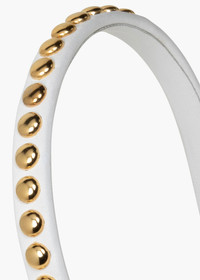 The Parker Headband is a sleek accessory designed to elevate your every day. Each one is handcrafted in New York from irresistibly soft lamb skin and is adorned with gold toned metal buttons placed so precisely and tightly that the thin leather band almost recedes, allowing the string of golden studs to appear like a halo atop the hair. Stack multiple headbands at once for a dramatic look with a bit of edge. Material The Parker Headband is handcrafted in New York from lamb skin and is adorned with gold toned metal buttons. We recommend storing headbands in their dust bag while not in use. Avoid contact with water, perfume, and other chemicals, including hairspray, which should be used only before placement in the hair.