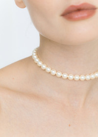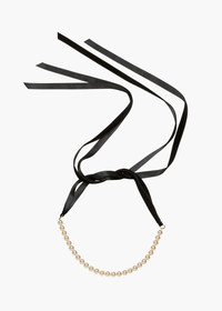 A thoroughly unique take on a classic strand of pearls: the Pearl Ribbon Tie offers a variety of distinct looks in a single chic piece. Whether tied around the neck as a choker necklace, or worn in the hair adorning a chignon or as a headband, it adds a breath of fresh air to any look. Each one is made by hand in our New York studio, featuring a string of dainty pearlescent crystals, secured by a contrasting velvet ribbon, which ties in the back for a fully customizable fit Material The Pearl Ribbon Tie is made by hand in New York of Austrian crystal pearls with a velvet ribbon tie. We recommend treating this piece as you would a piece of jewelry, and storing in the dust bag when not in use. Avoid contact with water, perfume, and other chemicals, including hairspray, which should be used before placement in the hair or on the body.