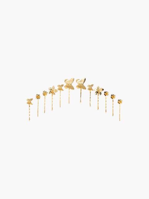 If you've loved our bestselling Mazarine Bobby Pin, the Pippa Bobby Pin Set is the ideal accoutrement. This set of five is comprised of sprightly golden butterflies of different sizes, complete with intricately etched details. We love the versatile Pippa Bobby Pins mixed with the beloved Mazarine Bobby Pin, as well as the classic Perla Bobby Pins. Material The Pippa Bobby Pins are a set of five, made by hand in New York of gold-plated brass on a durable steel bobby pin, designed to stay firmly in place, once other pins have the hairstyle securely fastened. We recommend treating each pin as you would a piece of jewelry, and storing in the dust bag when not in use. Avoid contact with water, perfume, and other chemicals, including hairspray, which should be used before placement in the hair.