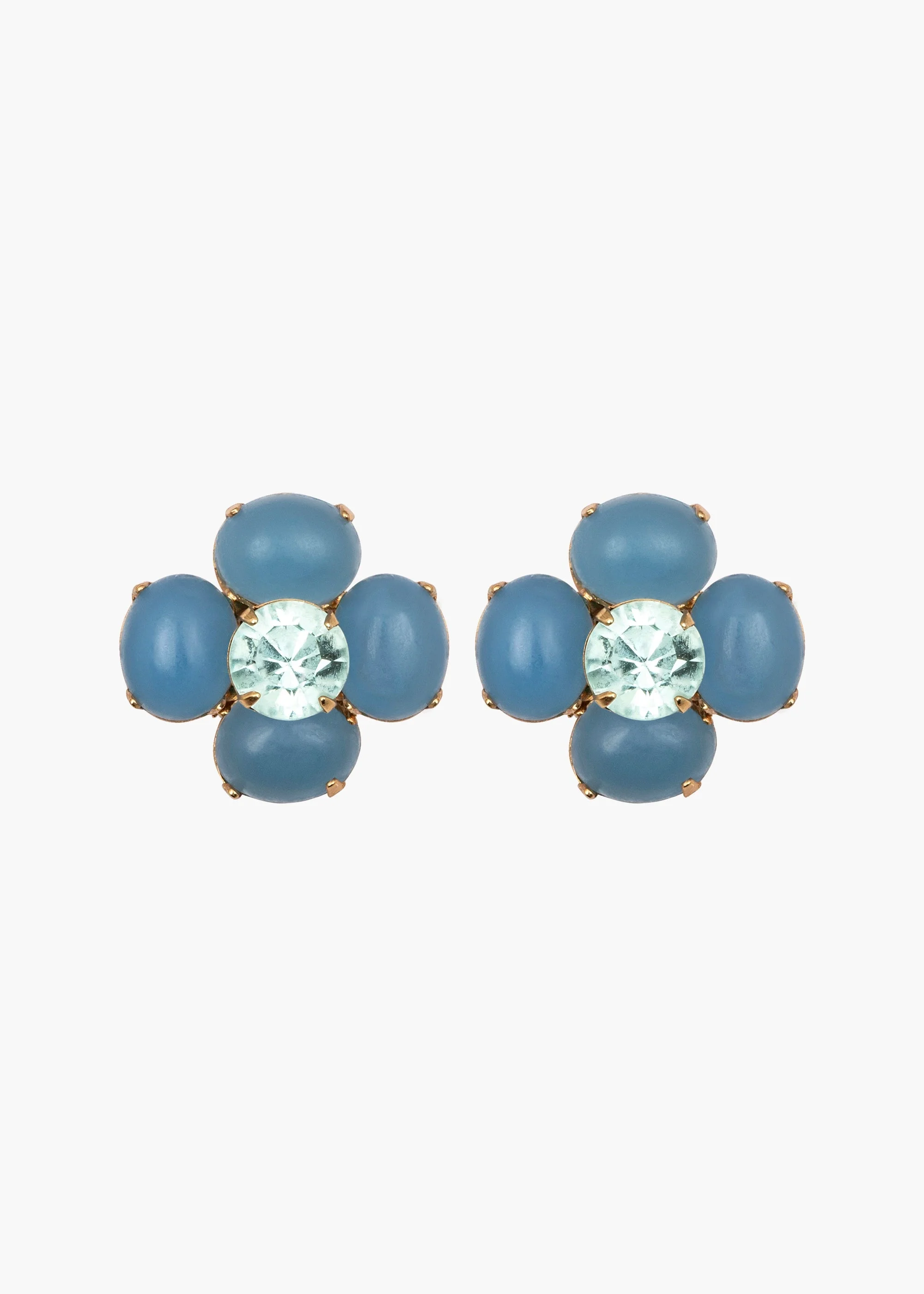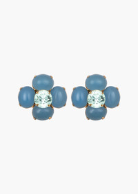 Inspired by 1960s mod florals, the Quinn Earrings are a delicious pop of color, flaunting the vivid hues of semi-precious stones like pink opal, blue agate, and red garnet. Made by hand in New York, the bubble-flower shape is achieved using cabochon gemstones for petals, with a fine Austrian crystal in the center. The stud is complete with an 18-karat gold-plated setting. Dimensions: 1" Material The Quinn Earrings are made by hand in New York from natural semi-precious stones, Austrian crystals, and 18K gold plated brass. All stones have natural variances in color and markings that make each one unique. They have a surgical-steel post, are nickel-free and safe for sensitive skin. We recommend storing earrings in their dust bag while not in use, and avoiding contact with water, perfume, hairspray, and other chemicals.