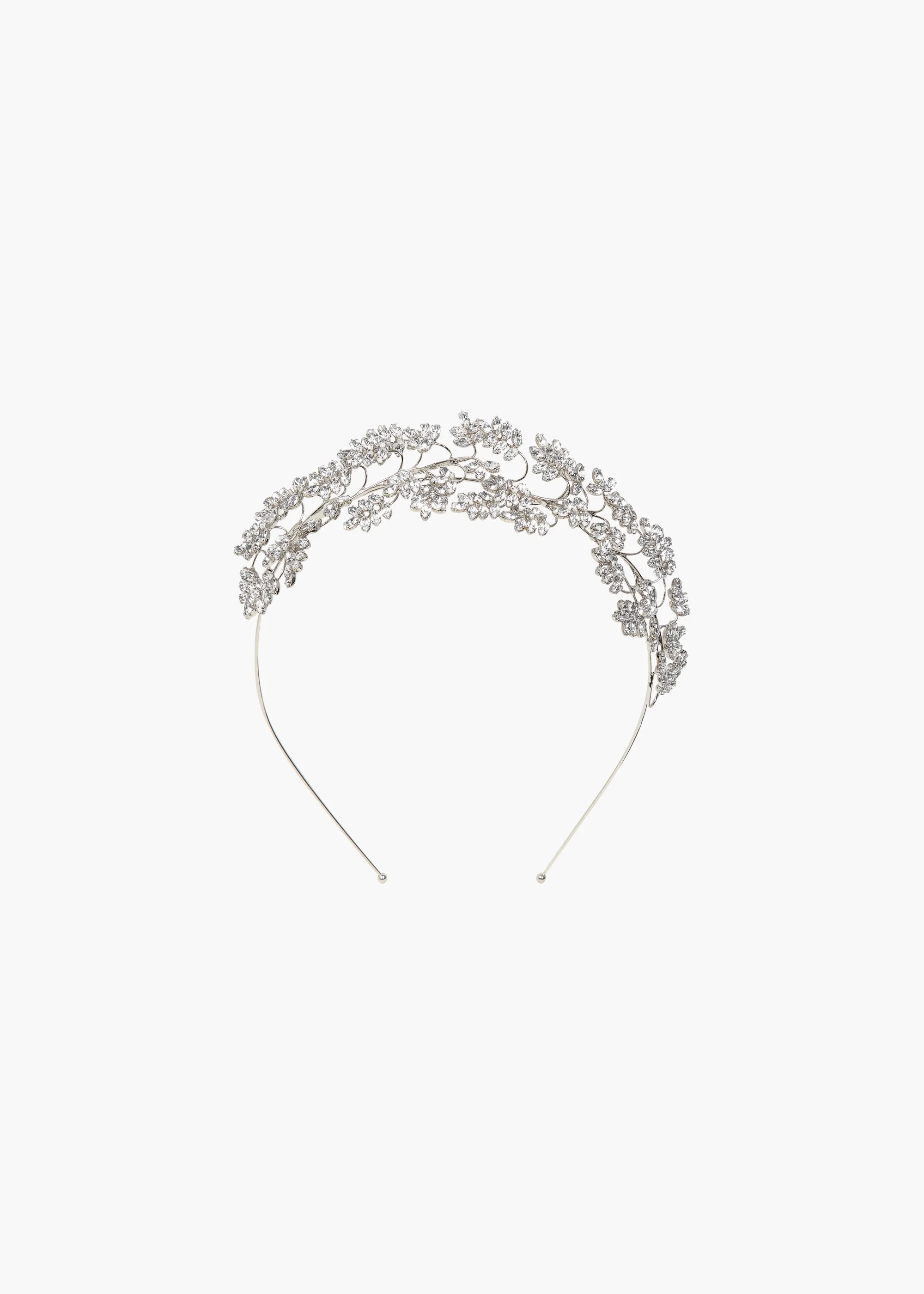 One of the most intricate headpieces we've ever designed, the Raquel Tiara references antique royal tiaras from the turn of the 20th century. Emulating a climbing wisteria vine, the wiring is bent by hand in a time-intensive process, to create an organic sculptural look, with leaves formed by individually-placed Austrian crystals. Made by hand in New York, the fine rhodium-plated base disappears in the hair, allowing the romantic details to shine. Material The Raquel Tiara is made by hand in New York of rhodium plated brass featuring hand formed wire wisteria vines and Austrain crystal leaves. We recommend treating this tiara as you would a piece of jewelry, and storing in the dust bag when not in use. Avoid contact with water, perfume, and other chemicals, including hairspray, which should be used before placement in the hair.