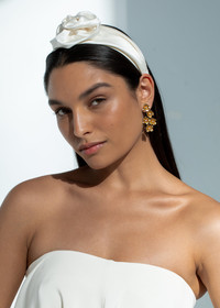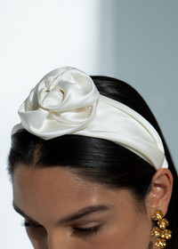 The Rosalina Headband is a fresh-faced finishing touch, defined by well-placed volume that flatters every face. Made by hand in New York, the sculptural precision with which the silk is draped creates an architectural, lifelike flower. The floral accent sits on a gathered silk headband, complete with thoughtful details including a grosgrain-lined interior, wrapped ends, and a flexible base. Dimensions: 2 inch width, 1 inch height Material The Rosalina Headband is made by hand in New York from silk and lined in grosgrain to ensure ultimate comfort and promote hair health. We recommend storing headbands in their dust bag while not in use. Avoid contact with water, perfume, and other chemicals, including hairspray, which should be used only before placement in the hair.