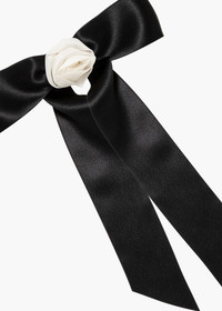 The Rosette Bow Barrette has an unmistakably sensual flare that brings any look to life. The flower is expertly draped by hand, and the bow's silk ribbon is selected to fall with a languid grace. Made by hand in New York, this bow is finished with an automatic French barrette closure, making it easy to wear in an endless number of hairstyles, in any type of hair. Dimensions: 7 inch width, 10 inch length Material The Rosette Bow Barrette is made by hand in New York of silk ribbon, a hand embroidered silk rosette, and finished with a steel French barrette closure. We recommend treating this bow as you would a piece of jewelry, and storing in the dust bag when not in use. Avoid contact with water, perfume, and other chemicals, including hairspray, which should be used before placement in the hair.