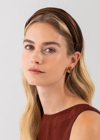 Channeling style icons of the 1960s, the Sabrina Headband emulates the look of a headscarf, with the simplicity of an easy-to-place headband. Made by hand in New York, silk satin is hand-draped to achieve this specific loosely gathered shape, while subtle padding creates volume to amplify the effect. The finished look is at once casual and chic— collect multiple colors to elevate any outfit. Dimensions: 2in Material The Sabrina headband is crafted in New York from hand-draped silk satin, and is lined in silk to ensure ultimate comfort and promote hair health. We recommend storing headbands in their dust bag while not in use. Avoid contact with water, perfume, and other chemicals, including hairspray, which should be used only before placement in the hair.