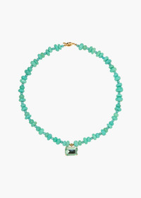 An endlessly stackable piece, the Salerno Necklace captures the carefree essence of summer. Available in a selection of semi-precious gemstones, including chrysoprase and carnelian, each bead is hand-polished to create a glossy surface, and sorted by hand in alternating sizes to form a graphic pattern. Made in New York, it is finished with an emerald-cut crystal pendant, playfully set horizontally, and a T-bar clasp. Dimensions: 19 inch length Material The Salerno Necklace is handmade in New York of hand-carved semiprecious carnelian, citrine, or chrysoprase gemstones with a 18K gold plated Czech crystal pendant and T-bar and loop clasp. All stones have natural variances in color and markings that make each one unique. We recommend storing necklaces in their dust bag while not in use, and avoiding contact with water, perfume, hairspray, and other chemicals.