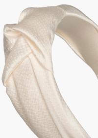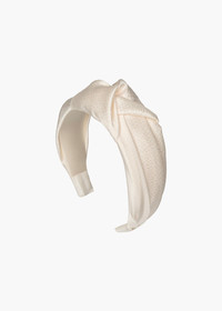 The Samaya Headband in Hammered Silk reimagines the iconic Jennifer Behr knotted shape, in lush hammered silk. Crafted by hand in our Brooklyn studio, the fabric is masterfully draped by hand to achieve the perfect flattering shape. The look is grounded by a flexible headband base, designed for lasting comfort. Dimensions: 2.25 inches wide, 0.5 inches padding Material This Samaya Headband is made in New York from Italian silk, and lined in silk to ensure ultimate comfort and promote hair health. We recommend storing headbands in their dust bag while not in use. Avoid contact with water, perfume, and other chemicals, including hairspray, which should be used only before placement in the hair.