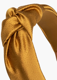 The Samaya Headband in Hammered Silk reimagines the iconic Jennifer Behr knotted shape, in lush hammered silk. Crafted by hand in our Brooklyn studio, the fabric is masterfully draped by hand to achieve the perfect flattering shape. The look is grounded by a flexible headband base, designed for lasting comfort. Dimensions: 2.25 inches wide, 0.5 inches padding Material This Samaya Headband is made in New York from Italian silk, and lined in silk to ensure ultimate comfort and promote hair health. We recommend storing headbands in their dust bag while not in use. Avoid contact with water, perfume, and other chemicals, including hairspray, which should be used only before placement in the hair.