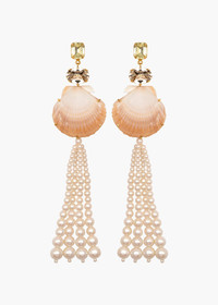 A poetic amalgamation of eclectic materials, the Sanibel Earrings channel the excitement of a seaside getaway. Made by hand in New York with fine crystals and genuine scallop seashells, the hand-formed setting is crafted using fine jewelry techniques so as not to interrupt the shell's organic silhouette. They are finished with vintage Japanese pearl tassels, with strands of pearls graduated in size for added impact. Dimensions: 5 3/8 inch length Material The Sanibel Earrings are made by hand in New York from Czech crystals, natural seashells, and a vintage crystal pearl tassel. All shells have natural variances in color and markings that make each one unique. They have a surgical-steel post, are nickel-free and safe for sensitive skin. We recommend storing earrings in their dust bag while not in use, and avoiding contact with water, perfume, hairspray, and other chemicals.