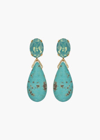 The Sanremo Earrings capture the essence of our latest collection, which leans heavily on the magic found when combining organic found materials with sparkling crystals. They feature semi-precious turquoise in an oversized teardrop shape, suspended from an opalescent crystal. We love turquoise for the natural variations found in each stone, which means no two pairs are entirely alike. Dimensions: 1 3/4 inch length Material The Sanremo Earrings are made by hand in New York from semi-precious turquoise stone drops and Czech crystals. All stones have natural variances in color and markings that make each one unique. They have a surgical-steel post, are nickel-free and safe for sensitive skin. We recommend storing earrings in their dust bag while not in use, and avoiding contact with water, perfume, hairspray, and other chemicals.
