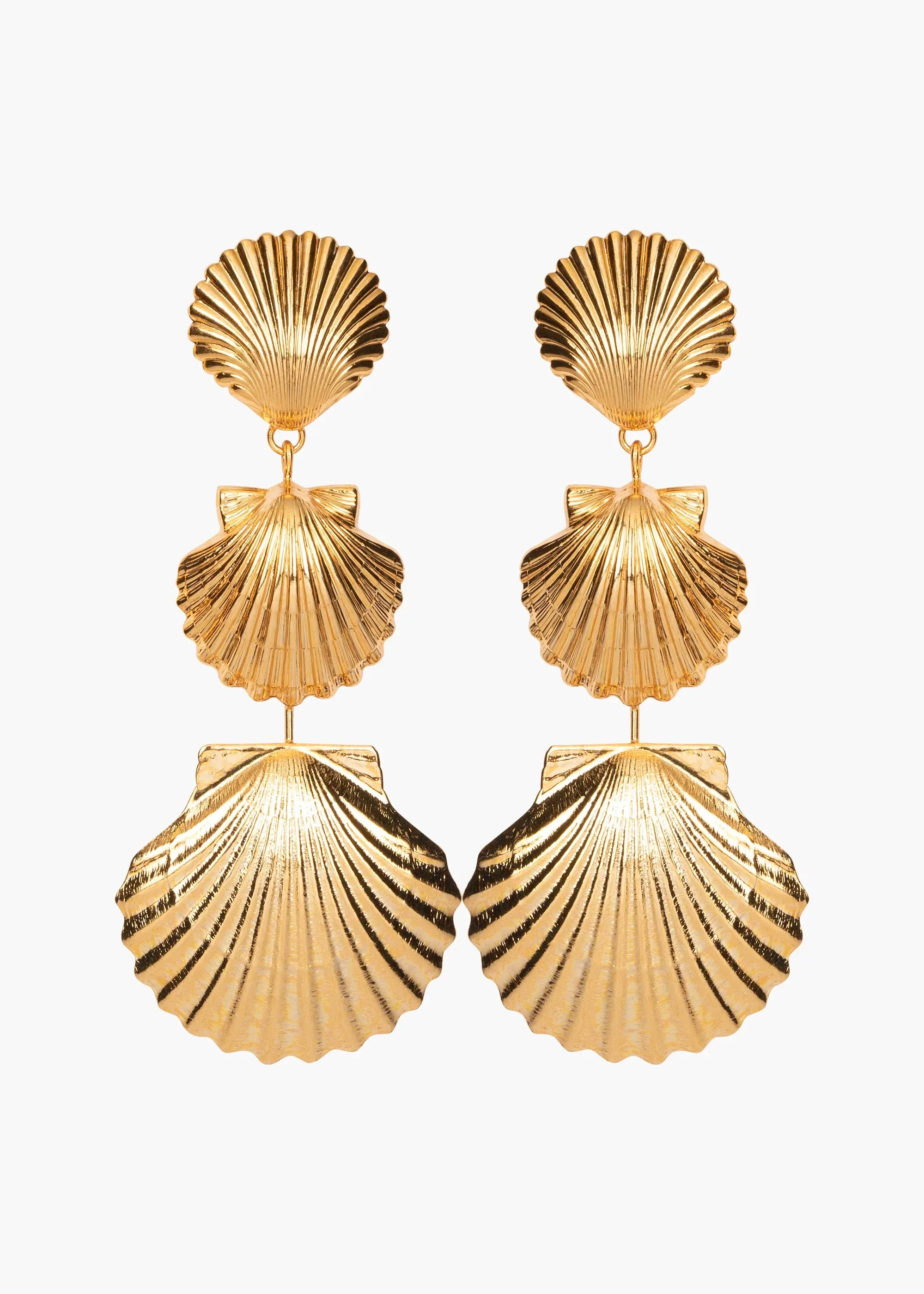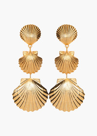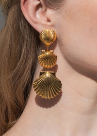 With golden scallops graduated in size, the Selkie Earrings conjure fond memories of collecting shells on a seashore. Made by hand in New York, they are plated with 18-karat gold for exceptional luster. These linear pendant earrings have a graceful oscillating movement that harmoniously syncs with your every motion. Dimensions: 3 1/4 inch length Material The Selkie Earrings are made by hand in New York from 18K gold plated brass. They have a surgical-steel post, are nickel-free and safe for sensitive skin. We recommend storing earrings in their dust bag while not in use, and avoiding contact with water, perfume, hairspray, and other chemicals.