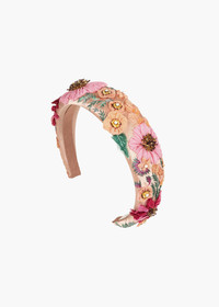 Featuring winding embroidery, crystal embellishment, and draped floral applique, the Sheryl Headband spares no detail. The bold floral design draws inspiration from romantic Pre-Raphaelite art, and the result is an undeniably dreamy finishing touch. The headband's bed of hand-dyed satin fabric is a triumph in itself, and the grosgrain-lined interior ensures it stays perfectly in place all day and night. Material The Sheryl Headband is made by hand in New York of hand-dyed fabric and crystal embellishment, on a satin fabric base, with a grosgrain-lined interior to promote hair health and ensure the headband stays in place. We recommend storing headbands in their dust bag while not in use. Avoid contact with water, perfume, and other chemicals, including hairspray, which should be used only before placement in the hair.