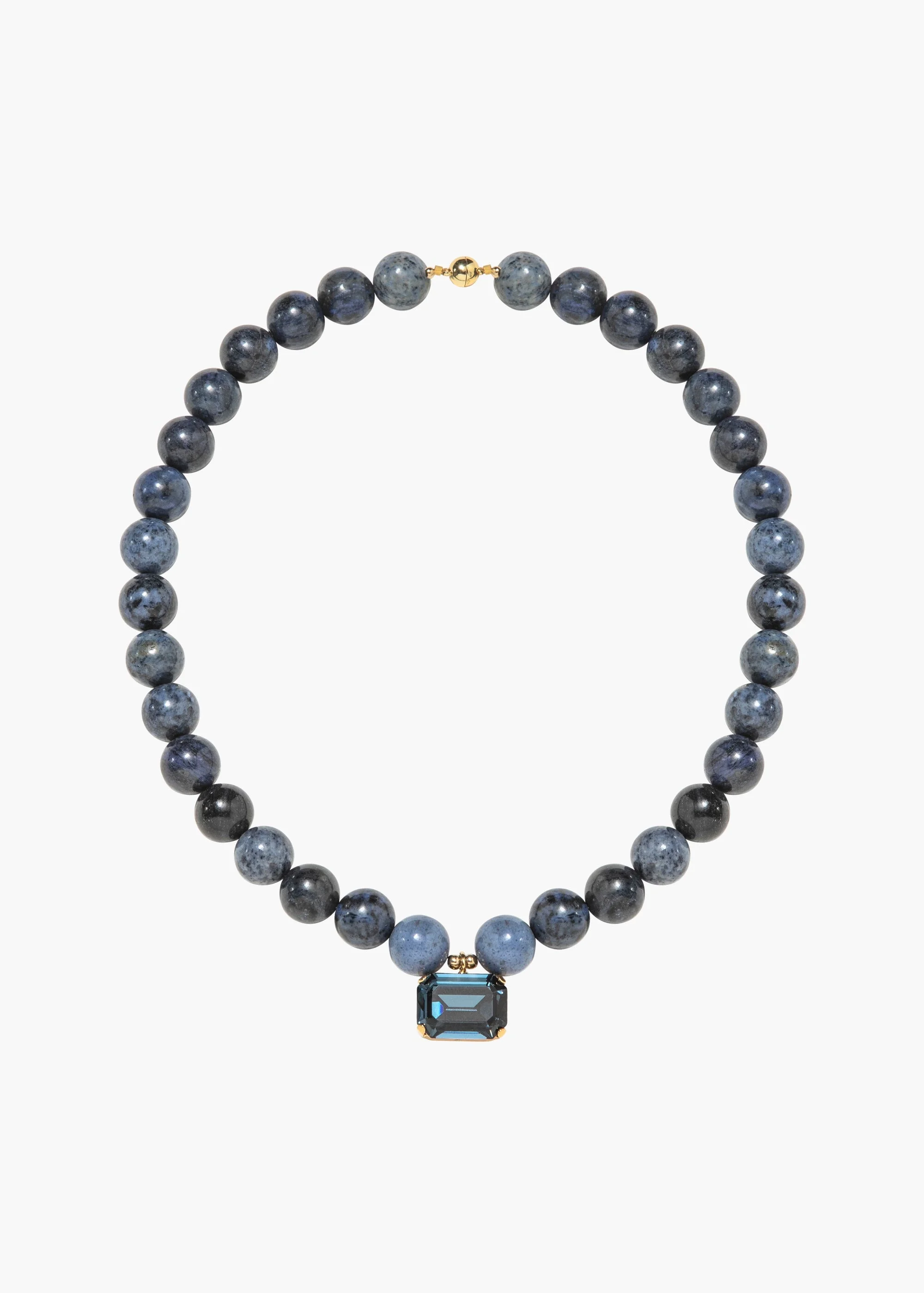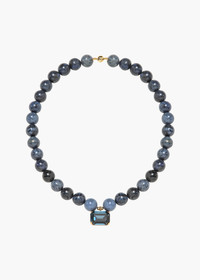 The Sidonie Necklace features natural semi-precious malachite beads, with an emerald-cut Austrian crystal pendant, chosen to complement the stones' natural hue. With its distinctive natural veining that makes each piece unique, malachite is known as the "stone of transformation," used for deep energy cleansing. It's finished with an 18-karat gold-plated magnetic clasp, making it particularly easy to wear, whether worn solo or layered in a stack. Dimensions: 17 1/2in x 3/8in (3/4in x 1/2in pendant) Material The Sidonie Necklace is handmade in New York of hand-carved semiprecious labradorite, rhodonite, hasonite, malachite, or lapis lazuli gemstones with a 18K gold plated Austrian crystal pendant and magnetic closure. All stones have natural variances in color and markings that make each one unique. We recommend storing necklaces in their dust bag while not in use, and avoiding contact with water, perfume, hairspray, and other chemicals.