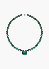 The Sidonie Necklace features natural semi-precious malachite beads, with an emerald-cut Austrian crystal pendant, chosen to complement the stones' natural hue. With its distinctive natural veining that makes each piece unique, malachite is known as the "stone of transformation," used for deep energy cleansing. It's finished with an 18-karat gold-plated magnetic clasp, making it particularly easy to wear, whether worn solo or layered in a stack. Dimensions: 17 1/2in x 3/8in (3/4in x 1/2in pendant) Material The Sidonie Necklace is handmade in New York of hand-carved semiprecious labradorite, rhodonite, hasonite, malachite, or lapis lazuli gemstones with a 18K gold plated Austrian crystal pendant and magnetic closure. All stones have natural variances in color and markings that make each one unique. We recommend storing necklaces in their dust bag while not in use, and avoiding contact with water, perfume, hairspray, and other chemicals.