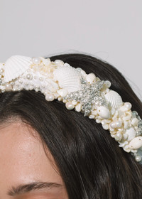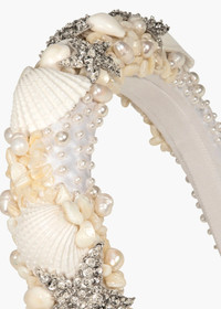 A dramatic seascape, the Stellamaris Headband is an artistic amalgamation of the rich materials in our latest collection, like barnacles adorning sea-sprayed cliffs. With intricate craftsmanship, it incorporates genuine seashells, mother of pearl, cultured pearls, and sparkling starfish applique, taking three individual artisans over fourteen hours to produce. The embellishment sits on a silk charmeuse padded headband. Width: 1.5 inch Height: 1 1/8 inch Material The Stellamaris Headband is made in India of fine Indian sea-scape motif embroidery on a silk satin covered base. We recommend treating this headband as you would a piece of jewelry, and storing in the dust bag when not in use. Avoid contact with water, perfume, and other chemicals, including hairspray, which should be used before placement in the hair. Imported.