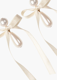The darling Sylvie Earrings feature classic elongated pearl drops, wrapped in a cheeky ribbon. These mood-boosting bows add a coquettish touch to even the simplest looks. The drop's swinging and the ribbon's fluttering unite to create alluring motion with your every turn. Material The Sylvie Earrings are made by hand in New York from 18K gold plated brass and crystal pearls with silk ribbon. They have a surgical-steel post, are nickel-free, and safe for sensitive skin. We recommend storing earrings in their dust bag while not in use, and avoiding contact with water, perfume, hairspray, and other chemicals.