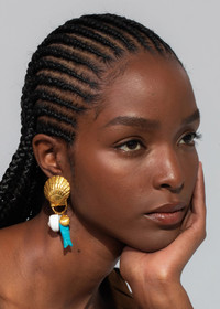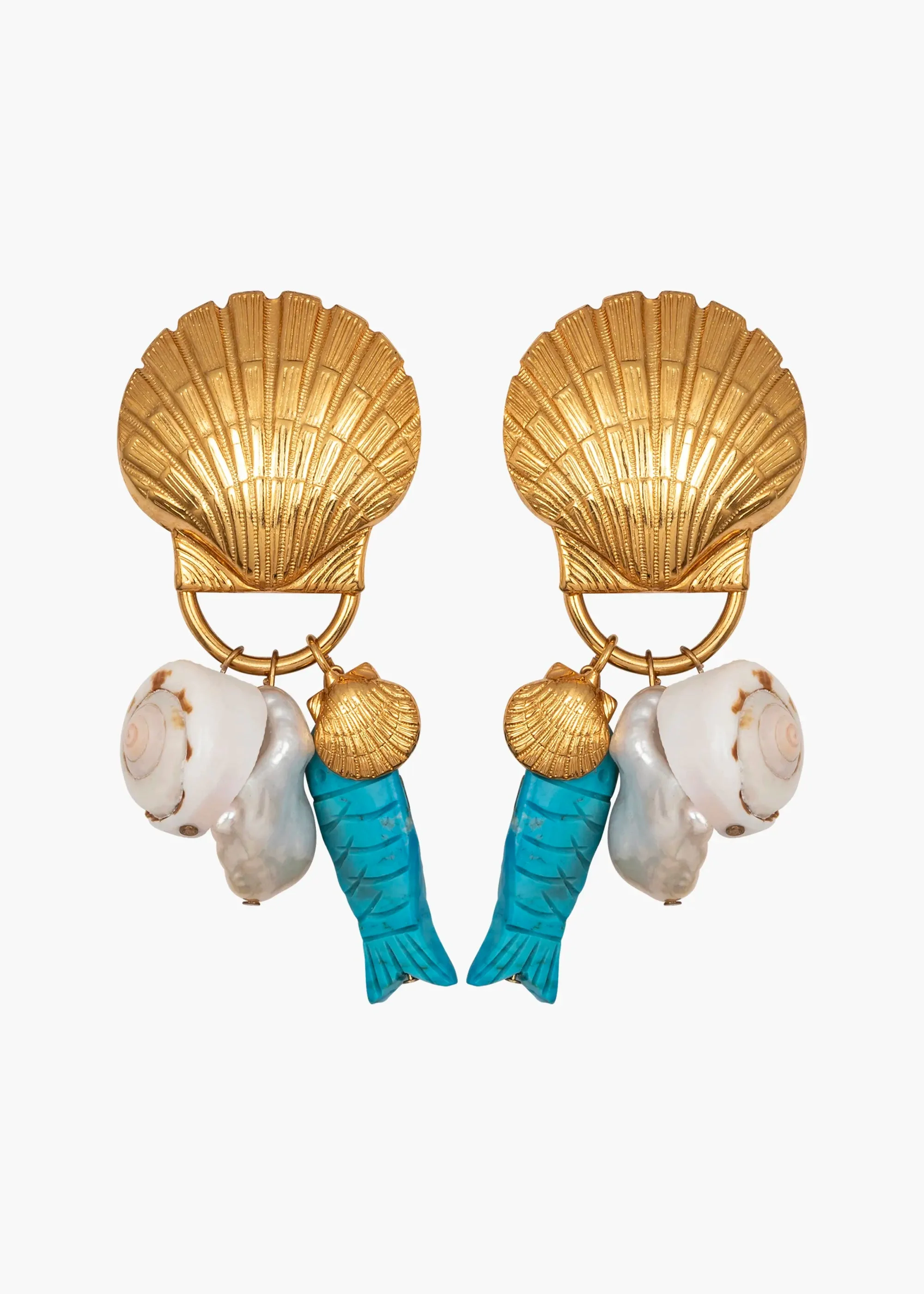 Inspired by the idea of treasured charms collected on travels over time, the Tarni Earrings have a decidedly eclectic appeal. They feature dangling pendants including a natural seashell, freshwater baroque pearl, hand-carved semi-precious turquoise fish, and delicate golden shell shape, all suspended from an 18-karat gold-plated scallop shell motif. With their diverse materials, these earrings pair well with many necklaces in our collection. Dimensions: 3 inch length Material The Tarni Earrings are made by hand in New York from 18K gold plated brass, freshwater baroque pearl, hand-carved turquoise stone, and natural seashell charms. All shells have natural variances in color and markings that make each one unique. They have a surgical-steel post, are nickel-free and safe for sensitive skin. We recommend storing earrings in their dust bag while not in use, and avoiding contact with water, perfume, hairspray, and other chemicals.
