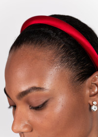 An ultra-chic take on our iconic padded headband shape, the Tiana Headband assumes an air of sophistication that will take you anywhere. This headband's diminutive profile makes it the perfect understated finishing touch. Each one is crafted by hand in New York from lustrous silk, and comfortable to wear thanks to its flexible headband base. Dimensions: 0.5 inch width, 0.5 inch height Material The Tiana Headband is made by hand in New York from silk and lined in grosgrain to ensure ultimate comfort and promote hair health. We recommend storing headbands in their dust bag while not in use. Avoid contact with water, perfume, and other chemicals, including hairspray, which should be used only before placement in the hair.