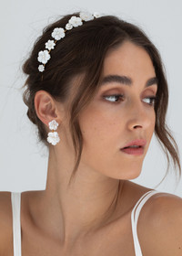 Mother of pearl is one of our favorite mediums, and the Tibby Earrings are a compelling rationale. Featuring two intricately carved mother of pearl flowers with a smaller pearl center, the material's organic opalescence is magnified by the flowers' sculptural nature. The Tibby Earrings pair perfectly with our mother of pearl hair accessories, like the Jenna Headband or the Zia Bobby Pins. Material The Tibby Earrings are made by hand in New York from 18K gold plated brass and mother of pearl flowers. They have a surgical-steel post, are nickel-free, and safe for sensitive skin. We recommend storing earrings in their dust bag while not in use, and avoiding contact with water, perfume, hairspray, and other chemicals.