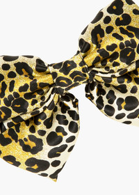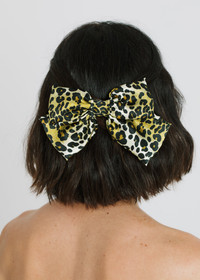 Sweet with a wild streak, the Tilly Bow Barrette adds a playful yet sophisticated flair to any look. This rich leopard printed bow is hand crafted from 100% silk and finished with an automatic French barrette clasp for easy and secure placement in the hair. Material The Tilly Bow Barrette is made by hand in New York of 100% silk custom printed fabric and finished with a steel French barrette closure. We recommend treating this bow as you would a piece of jewelry, and storing in the dust bag when not in use. Avoid contact with water, perfume, and other chemicals, including hairspray, which should be used before placement in the hair.