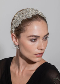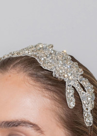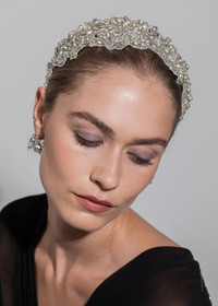 The Tressa Headband crowns your look with vintage-inspired drama, giving the sublime appearance of jewels encrusted directly into the hair. The sprawling floral motif is hand-embroidered with Austrian crystals and crystal beads, the embellishment so dense, the sparkle is endless. The fine rhodium-plated wire headband base disappears into the hair when worn. Material The Tressa Headband is made in New York of hand-embroidered Austrian crystals and crystal beads on a rhodium plated steel headband base for weightless comfort. We recommend treating this headband as you would a piece of jewelry, and storing it in the dust bag when not in use. Avoid contact with water, perfume, and other chemicals, including hairspray, which should be used before placement in the hair.