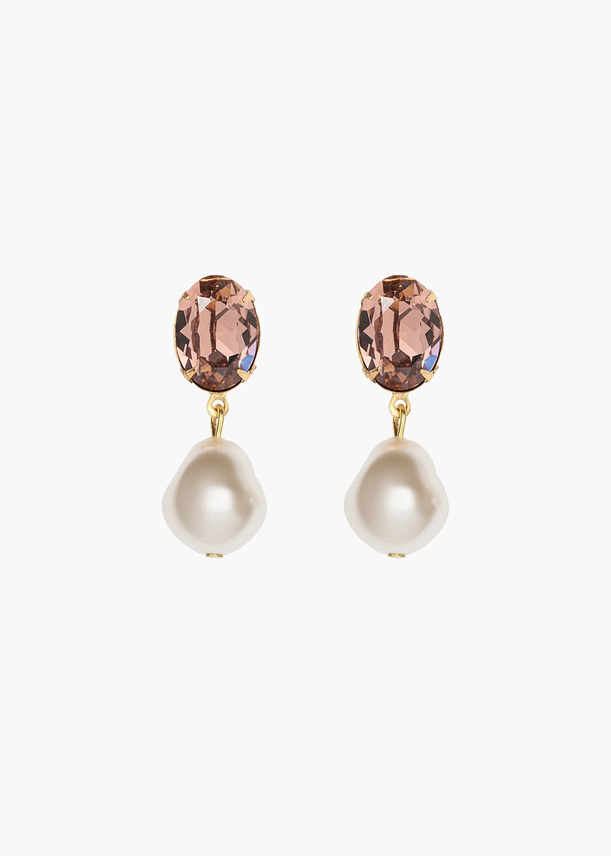 Playful, yet refined, the Tunis Earring offers punchy, saccharine hues, offset with a baroque-shaped glass pearl, which gives this piece incredible movement. Material The Tunis Earring is a post earring with a surgical-steel post. Our earrings are nickel-free and safe for sensitive skin. This earring is crafted in New York from 18K gold plated brass, glass crystals, and glass pearl. We recommend storing earrings in their dust bag while not in use, and avoiding contact with water, perfume, hairspray, and other chemicals.