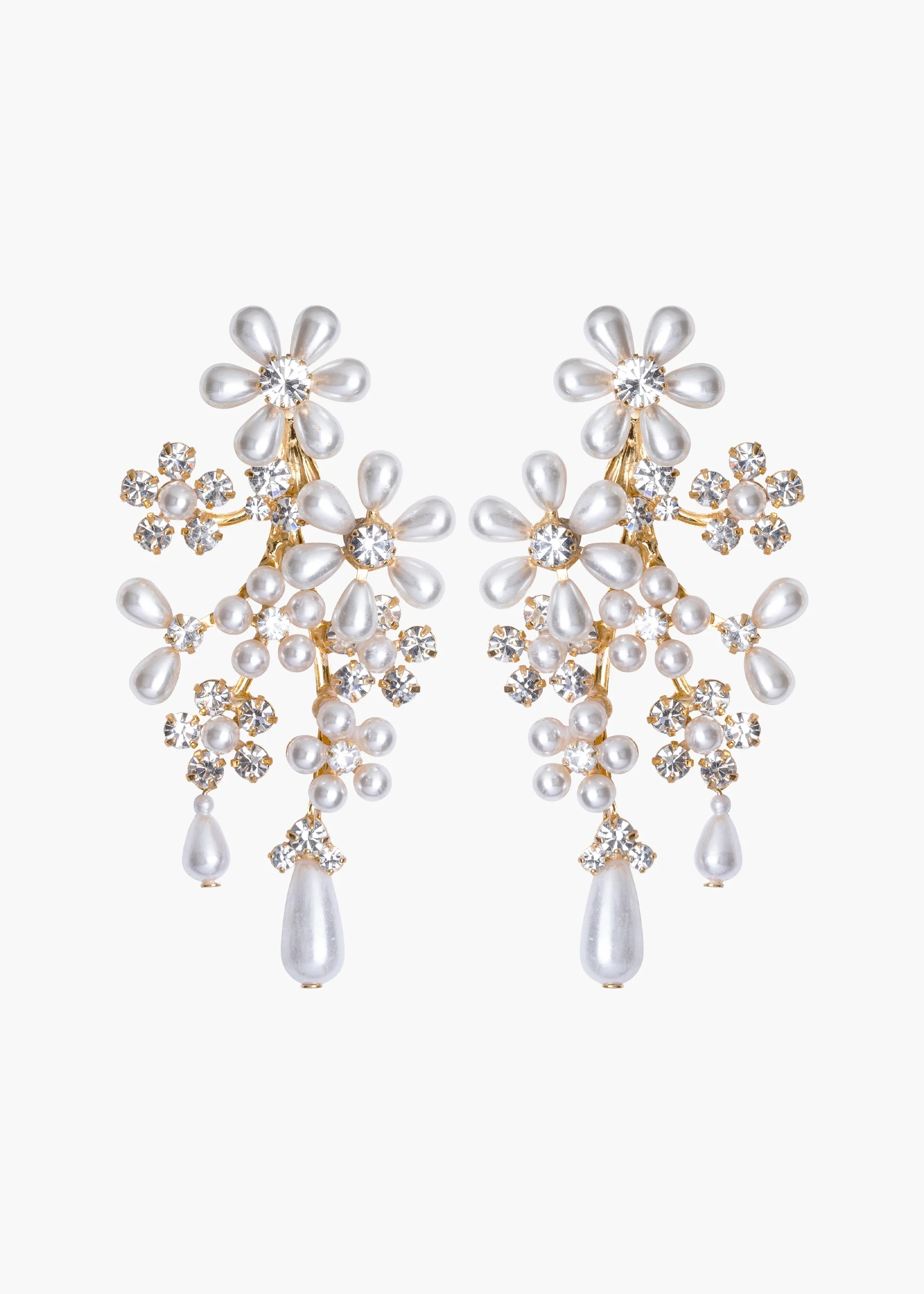 Reminiscent of cherry blossoms blooming in the spring, the Ursella Earrings are a sprawling, romantic floral branch. A wearable work of art, these chandelier earrings are plated in an antique gold finish to give the pearls a distinct warmth, complemented by glowing crystal accents. Each pair is made by hand in New York, with dangling teardrop pearls, swaying like leaves in the breeze. Dimensions: 3.25" in length. Material The Ursella Earrings are made by hand in New York, from 18K gold or rhodium plated brass, crystals, and crystal pearls. They have a surgical-steel post, are nickel-free, and safe for sensitive skin. We recommend storing earrings in their dust bag while not in use, and avoiding contact with water, perfume, hairspray, and other chemicals.