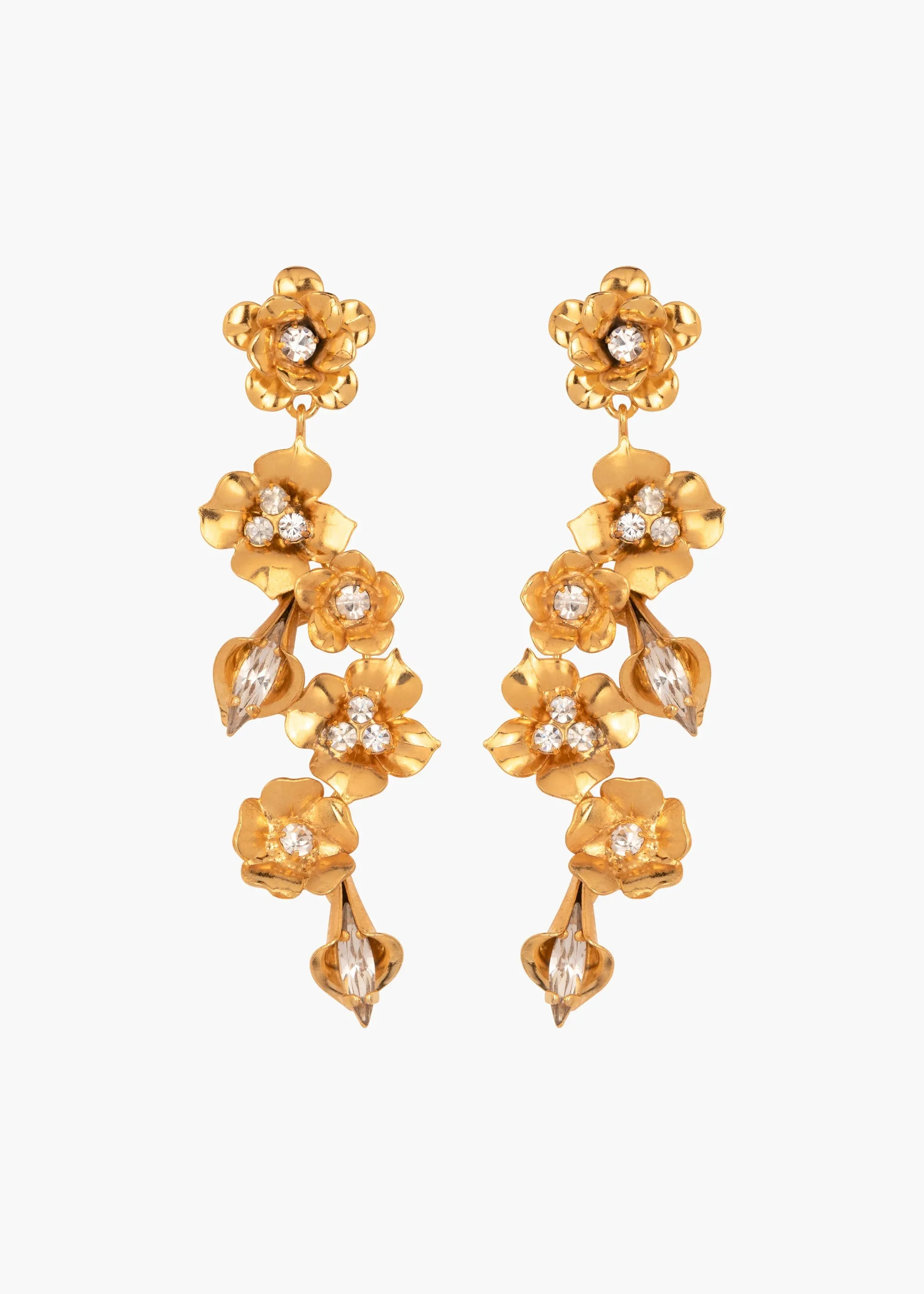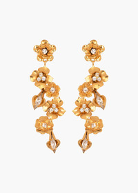 The Vanora Earrings draw inspiration from Viennese Art Nouveau design for a refined finished look. Made by hand in New York, this earring is dripping with 18-karat gold-plated flowers, set with Austrian crystals in special cuts that emphasize the unique shape of each floral element. Because of their handmade nature, these earrings are notably comfortable and surprisingly lightweight for their size. Dimensions: 2 5/8in x 5/8in Material The Vanora Earrings are made by hand in New York from 18K gold plated brass with Austrian crystal accents. They have a surgical-steel post, are nickel-free, and safe for sensitive skin. We recommend storing earrings in their dust bag while not in use, and avoiding contact with water, perfume, hairspray, and other chemicals.