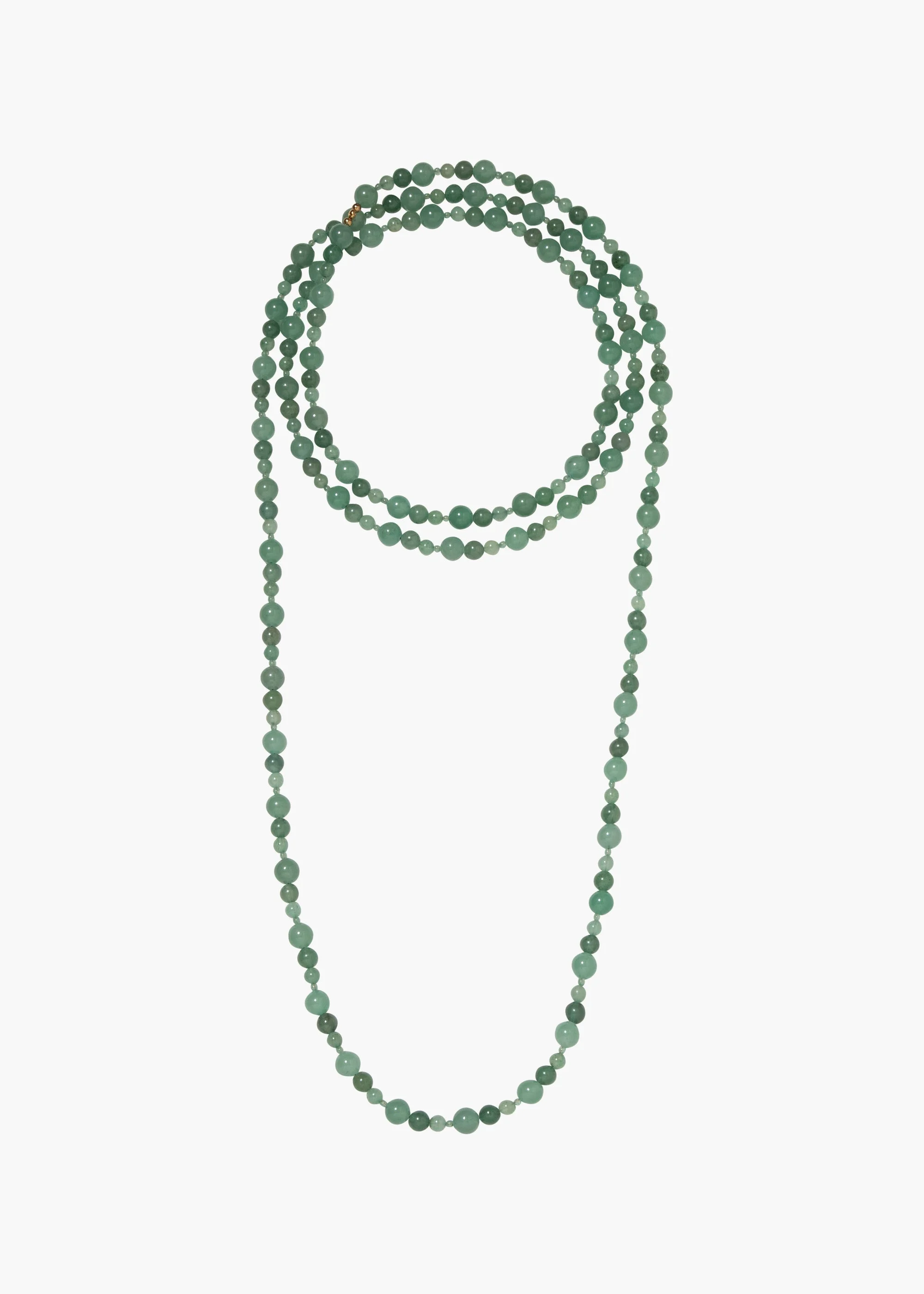 Conveying a classic elegance, the Veda Necklace is a uniquely versatile finishing touch from our Semi-Precious Collection, strung with aventurine. Beyond its undeniably striking green hue, aventurine is a gemstone prized for its association with good fortune. Measuring an impressive 74 inches, it can be styled a multitude of ways and wrapped numerous times, and is designed to be paired with other pieces in our Semi-Precious Collection. Dimensions: 74" length. Material The Veda Necklace is made by hand in New York from semi-precious stone beads. All stones have natural variances in color and markings that make each one unique. We recommend storing necklaces in their dust bag while not in use, and avoiding contact with water, perfume, hairspray, and other chemicals.