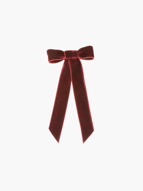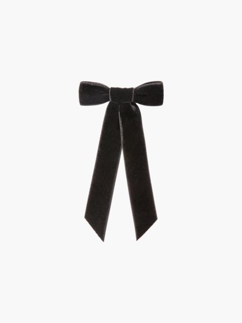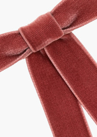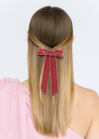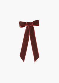 The bow that started it all: Our original Velvet Bow Barrette ignited a craze when it first launched, and it's been a best-seller ever since. Each bow is meticulously sewn by hand in our Brooklyn studio, and features a French barrette closure, making it easy to wear a multitude of ways: in the back of the hair, swept to the side, above a ponytail, and more. This bow is a hair wardrobe essential, and our Wide Velvet Bow Barrette will provide a more dramatic finishing touch. Dimensions: 3.5 x 6.5 inches Weight: 7g Material The Velvet Bow Barrette is made by hand in New York of velvet ribbon with a steel French barrette closure. We recommend treating this bow as you would a piece of jewelry, and storing in the dust bag when not in use. Avoid contact with water, perfume, and other chemicals, including hairspray, which should be used before placement in the hair.