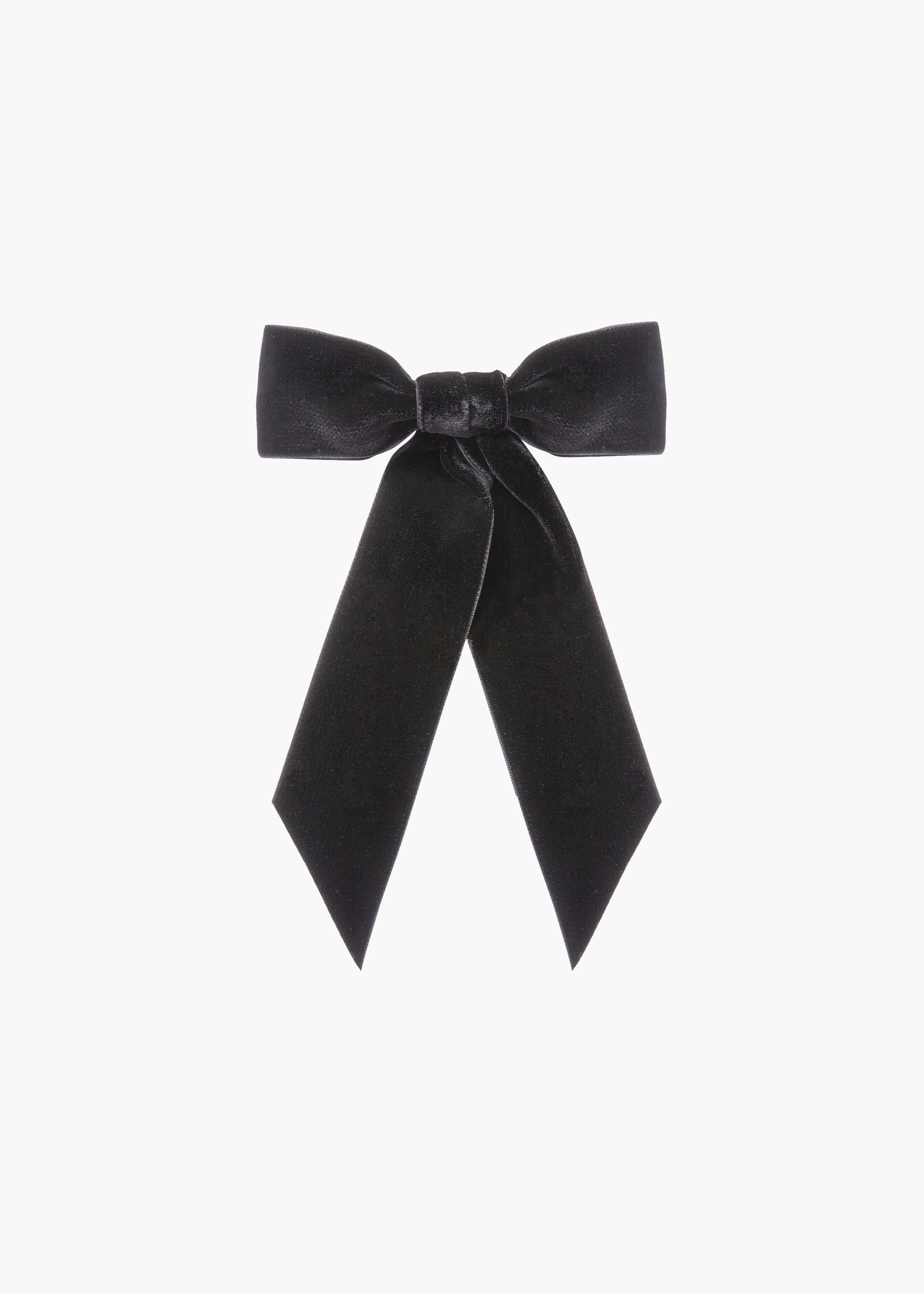 The Wide Velvet Bow Barrette is the larger sister of our classic Velvet Bow Barrette . Handmade in our Brooklyn studio, it features thick satin-edged silk velvet ribbon and a French barrette closure, making it easy to wear a multitude of ways, in any type of hair. This bow is a timeless addition to your hair collection. Dimensions: 6 x 9 inches Weight: 19g Material The Wide Velvet Bow Barrette is made by hand in New York of velvet ribbon with a steel French barrette closure. We recommend treating this bow as you would a piece of jewelry, and storing in the dust bag when not in use. Avoid contact with water, perfume, and other chemicals, including hairspray, which should be used before placement in the hair.