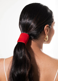 An enduring Jennifer Behr silhouette that dates to the brand's earliest days, the Velvet Ponywrap creates an instantly polished look. Each one is made by hand in New York of silk velvet lined in suede with a bendable wire interior, making it possible to perfectly curve it around your ponytail, no matter its thickness— simply form your ponytail and secure with the elastic, then bend the leather around the hair. The Japanese elastic is specifically selected for its strength and stretch— layer multiples at once for a statement look. Dimensions: 1 3/4in x 5in Material The Velvet Ponywrap is made by hand in New York of silk velvet, lined in suede with a bendable wire interior. We recommend treating this piece as you would a piece of jewelry, and storing in the dust bag when not in use. Avoid contact with water, perfume, and other chemicals, including hairspray, which should be used before placement in the hair.
