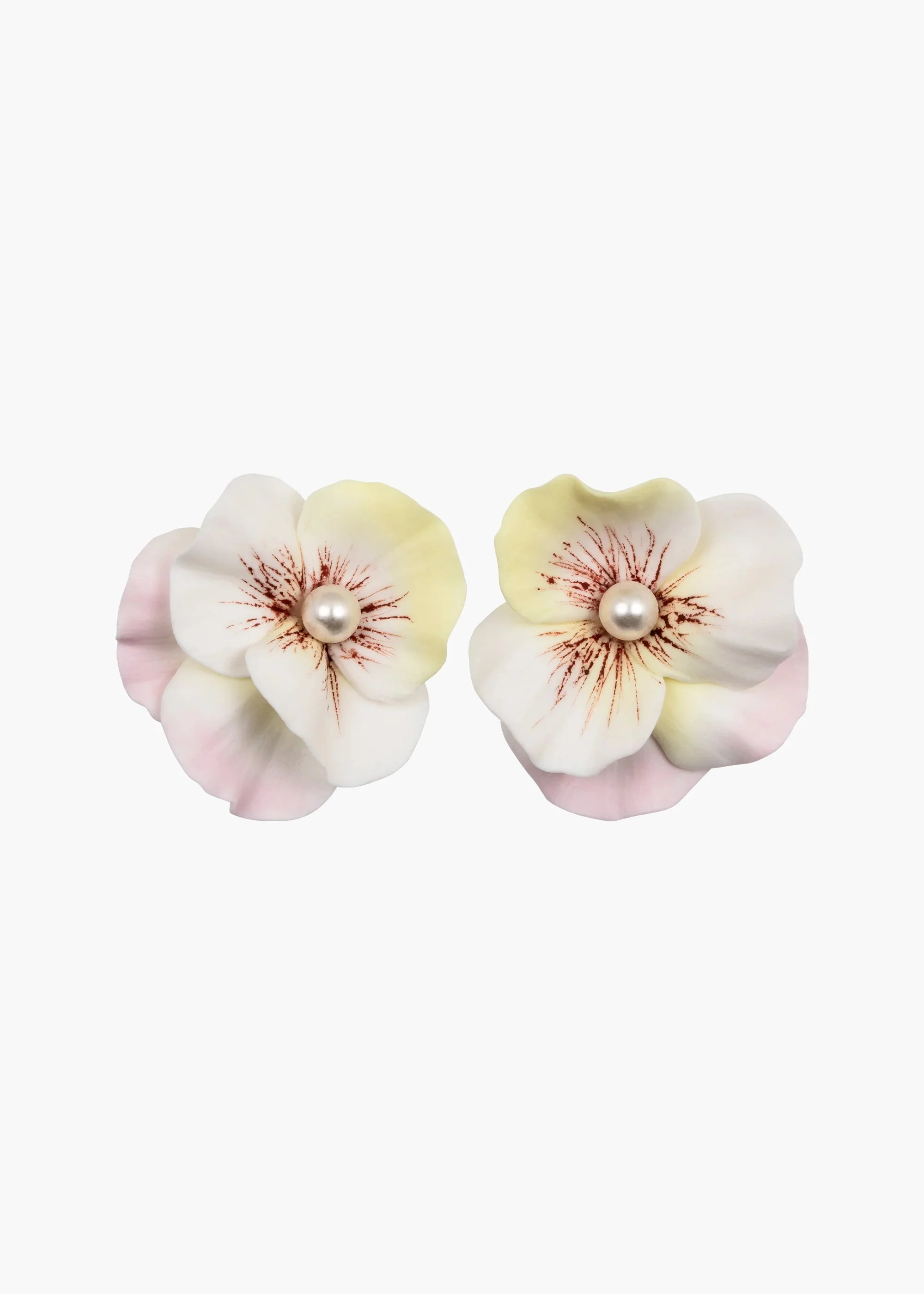 The Viletta Earrings are an ode to pansies— derived from the French word pensee ("thought"), these flowers are a token of thoughtfulness, and were used by the Victorians to signify a secret romance. Made in New York in a time-intensive, multi-step process, each individual clay petal is formed by hand, pressed with actual flowers to achieve true-to-life texture, and hand-painted with dimensional hue and intricate details that can only be achieved through this level of masterful handwork. Finished with a delicate crystal pearl, no two pairs are entirely alike— just as in nature. Material The Viletta Earrings are made by hand in New York from Ukrainian hand-sculpted polymer clay flowers with Czech pearl centers. All clay flowers have hand-made variances in color and markings, making each one unique. They have a surgical-steel post, are nickel-free, and safe for sensitive skin. We recommend storing earrings in their dust bag while not in use, and avoiding contact with water, perfume, hairspray, and other chemicals.