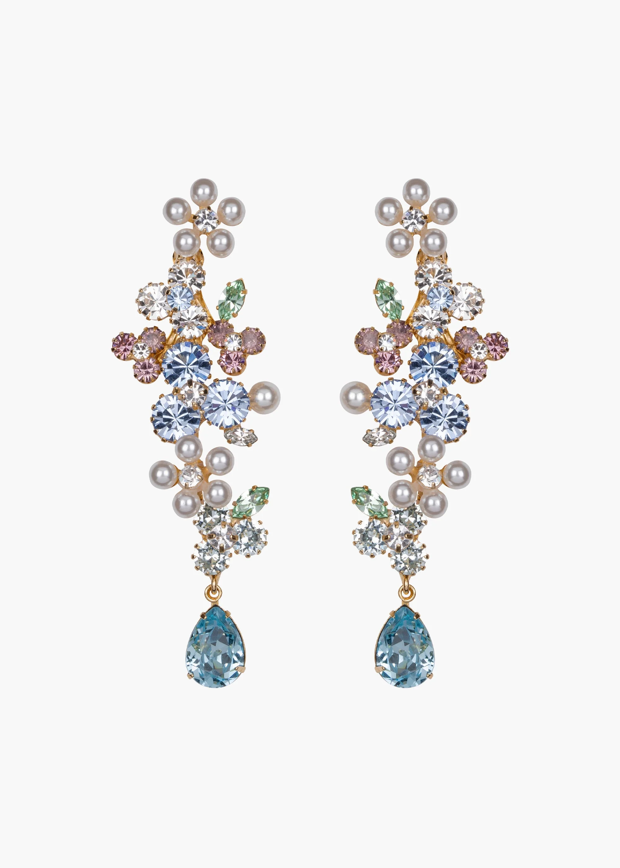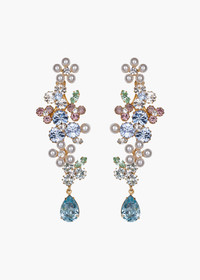 A conversation piece bursting with life, the Virna Earrings are inspired by wildflower bouquets. Crafted by hand in New York, the flowers are individually designed using crystals and pearl elements to represent different types of flowers, coming together to form a harmonious arrangement. Lightweight for their size due to their hand-made construction, the pear-shaped drops refract beams of sparkle as they gently sway. Dimensions: 4.25" length. Material The Vima Earrings are made by hand in New York from rhodium plated brass with czech crystal. They have a surgical-steel post, are nickel-free, and safe for sensitive skin. We recommend storing earrings in their dust bag while not in use, and avoiding contact with water, perfume, hairspray, and other chemicals.