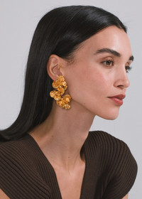 Inspired by our iconic Pansy Earrings, the Viola Earrings find our beloved flower embedded in a lush arrangement. Made by hand in New York, each individual petal in this bouquet of flowers is scrupulously sculpted by hand to achieve the lifelike texture and dimension, finished with 18-karat gold plating. These earrings are specifically designed to frame the face, with each individual component strategically placed during the design process. Dimensions: 2 1/2in x 1 1/2in Material The Viola Earrings are made by hand in New York from 18K gold plated brass. They have a surgical-steel post, are nickel-free, and safe for sensitive skin. We recommend storing earrings in their dust bag while not in use, and avoiding contact with water, perfume, hairspray, and other chemicals.