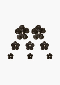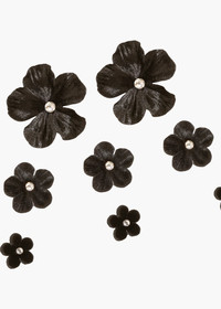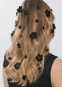With their unique magnet closure, the Viola Hair Magnets make it possible to achieve the look of flowers floating in the hair, even scattered up and down loose locks in a seemingly impossible arrangement. Made by hand in New York, this set of eight flowers is crafted from silk velvet and set with Austrian crystal and crystal pearl details. We love these flowers layered with the Kira Hair Magnet Set and Paige Hair Magnet Set. Dimensions: Small Flower - 5/8in, Medium Flower - 1in, Large Flower - 1 1/2in Material The Viola Hair Magnet Set are a set of 8 hair magnets with 3 different sizes, handmade in New York of silk velvet flowers and Austrian crystals or crystal pearls on durable silver toned magnetic hair clips They are designed to stay firmly in place, once other pins have the hairstyle securely fastened. We recommend treating each magnet as you would a piece of jewelry, and storing in the dust bag when not in use. Ensure to keep each magnet jewel set separate to avoid all magnets sticking together. Avoid contact with water, perfume, and other chemicals, including hairspray, which should be used before placement in the hair.