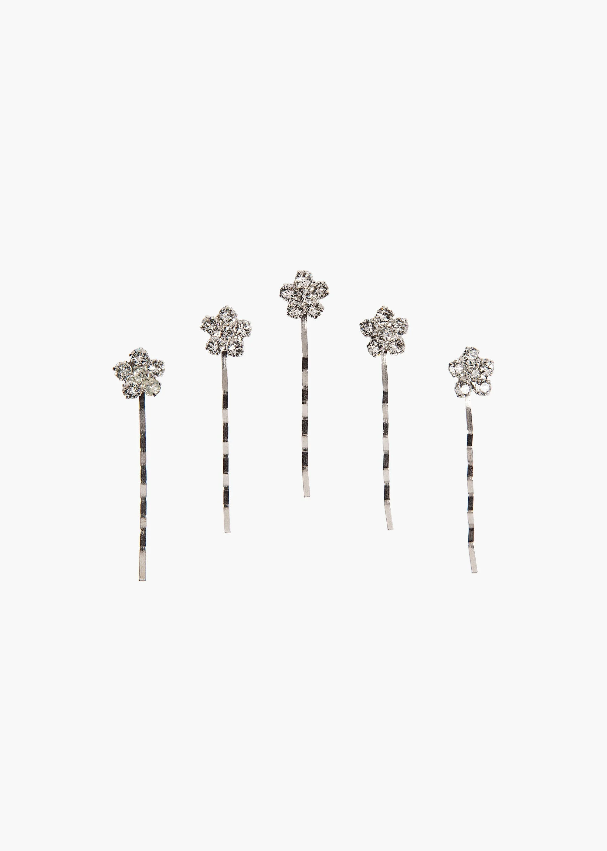 The Violet Bobby Pins are an essential for any hair wardrobe, as they're incredibly versatile while also creating plenty of sparkle. In this set of five, each pin consists of six individual Swarovski crystals, which are set by hand in our Brooklyn studio; this process is labor-intensive and time-consuming, but it creates exponentially more sparkle than a single larger stone. This delicate floral motif is a Jennifer Behr classic, so the Violet Bobby Pins coordinate perfectly with other pieces in the collection, like the Violet Comb and the Violet Stud Earrings . Dimensions: 2.25 x 0.5 inches Material The Violet Bobby Pins are a set of five, handmade in New York of Swarovski crystal on a durable steel bobby pin, designed to stay firmly in place, once other pins have the hairstyle securely fastened. We recommend treating each pin as you would a piece of jewelry, and storing in the dust bag when not in use. Avoid contact with water, perfume, and other chemicals, including hairspray, which should be used before placement in the hair.
