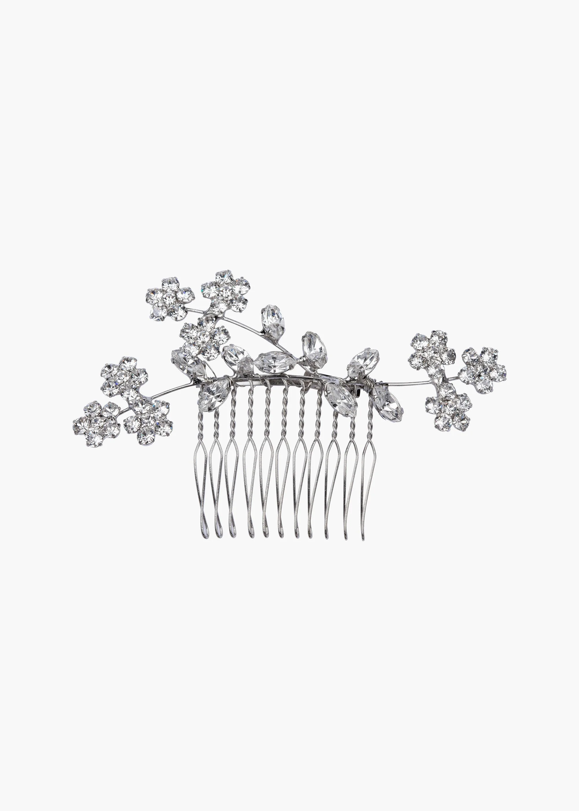 The Violet Comb creates a feminine, sparkling spray of flowers in your hair, with Swarovski crystal blooms in a delicate arrangement. Our combs can be worn solo, or paired with a bridal veil. We love the Violet Comb with Violet Bobby Pins mixed in, to create a look that's uniquely yours. Dimensions: 4 x 2.5 inches Weight: 17g Material The Violet Comb is made by hand in New York of Swarovski crystals, on a steel comb, which is designed to stay firmly in place, once other pins have the hairstyle securely fastened. We recommend treating this comb as you would a piece of jewelry, and storing in the dust bag when not in use. Avoid contact with water, perfume, and other chemicals, including hairspray, which should be used before placement in the hair.