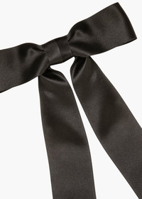 The Virginia Bow Barrette is a classic silhouette, featuring a wide, oversize bow crafted from double faced silk satin. An automatic bow barrette makes styling effortless. The natural movement of the length of the bow captures beautifully in photos, creating moments you'll want to capture and remember. Try pairing the bows with coordinating earrings . Material The Virginia Bow Barrette is made by hand in New York of double faced silk ribbon with a steel French barrette closure. We recommend treating this bow as you would a piece of jewelry, and storing it in the dust bag when not in use. Avoid contact with water, perfume, and other chemicals, including hairspray, which should be used before placement in the hair.