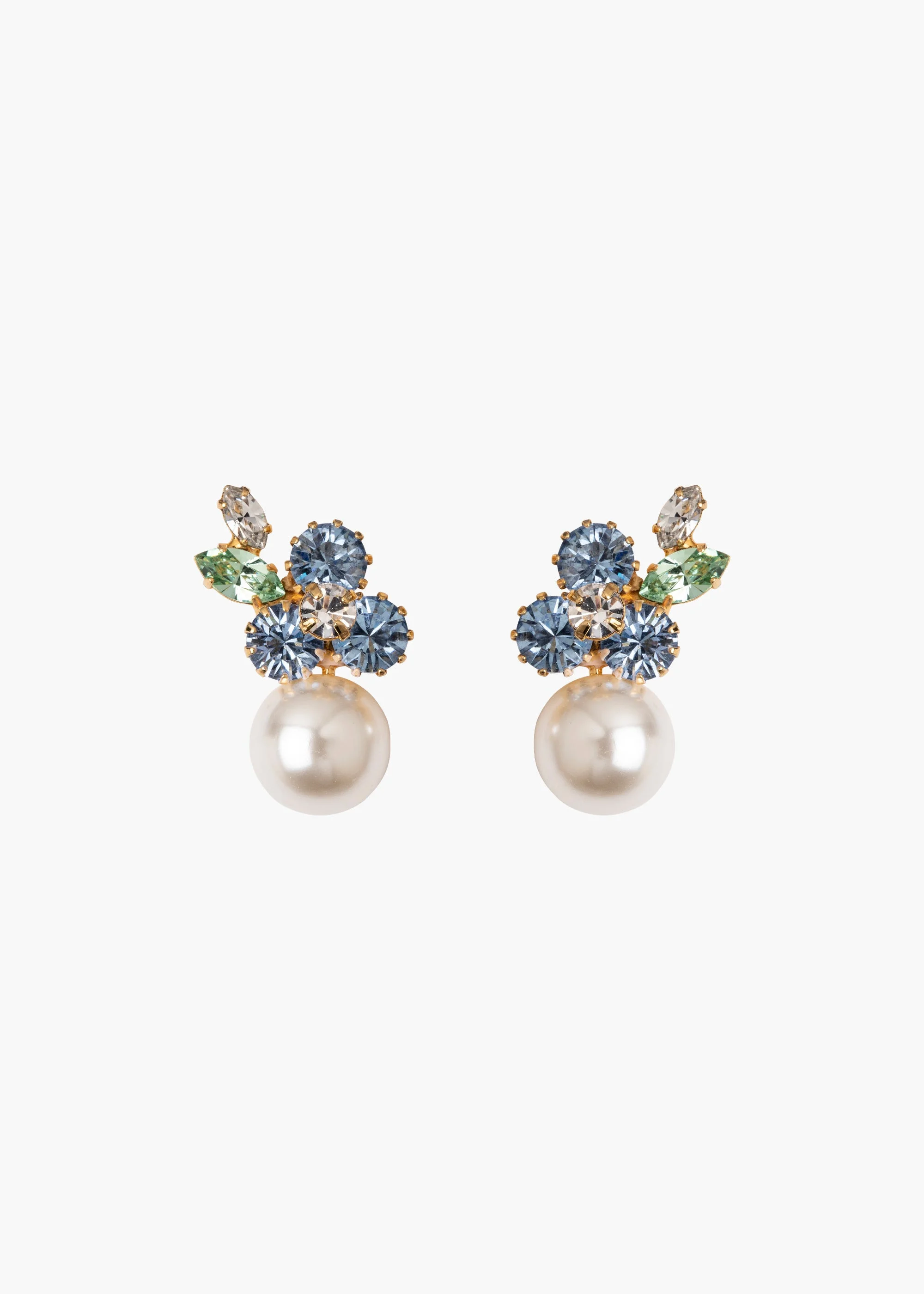 The sweet Vivi Earrings feature an intricate floral motif, offset with a striking drop. Crystals in an array of shapes and sizes are pieced together like a mosaic, forming a painterly floral composition. These crystal pearls are carefully selected to mimic a natural pearl, with the same color and shine. Dimensions: 1.125" length. Material The Vivi Earrings are made by hand in New York, from 18K gold or rhodium plated brass, crystals, and crystal pearls. They have a surgical-steel post, are nickel-free, and safe for sensitive skin. We recommend storing earrings in their dust bag while not in use, and avoiding contact with water, perfume, hairspray, and other chemicals.