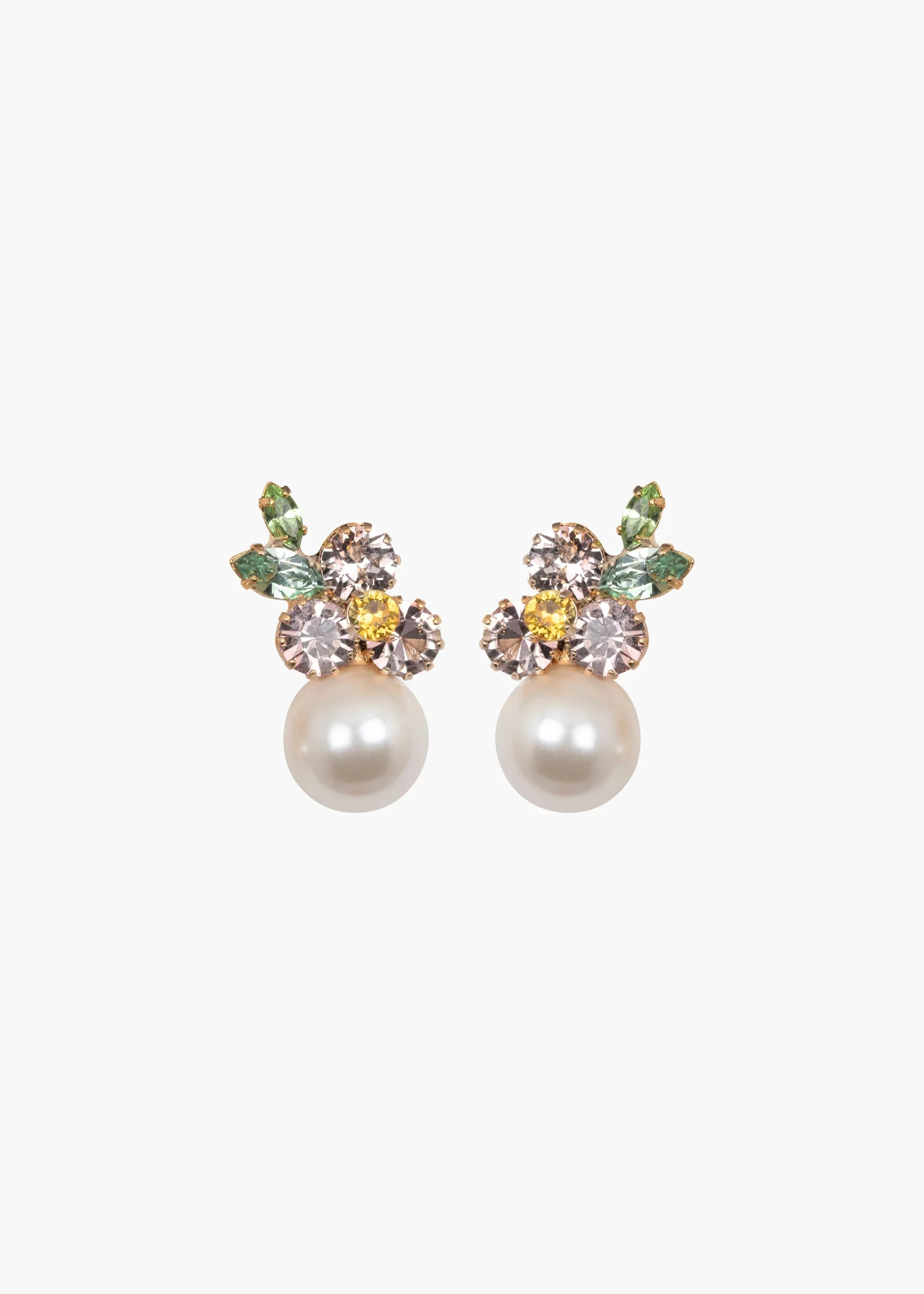 The sweet Vivi Earrings feature an intricate floral motif, offset with a striking drop. Crystals in an array of shapes and sizes are pieced together like a mosaic, forming a painterly floral composition. These crystal pearls are carefully selected to mimic a natural pearl, with the same color and shine. Dimensions: 1.125" length. Material The Vivi Earrings are made by hand in New York, from 18K gold or rhodium plated brass, crystals, and crystal pearls. They have a surgical-steel post, are nickel-free, and safe for sensitive skin. We recommend storing earrings in their dust bag while not in use, and avoiding contact with water, perfume, hairspray, and other chemicals.