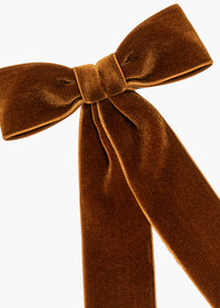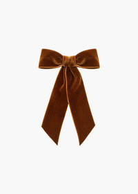 The Wide Velvet Bow Barrette is the larger sister of our classic Velvet Bow Barrette . Handmade in our Brooklyn studio, it features thick satin-edged silk velvet ribbon and a French barrette closure, making it easy to wear a multitude of ways, in any type of hair. This bow is a timeless addition to your hair collection. Dimensions: 6 x 9 inches Weight: 19g Material The Wide Velvet Bow Barrette is made by hand in New York of velvet ribbon with a steel French barrette closure. We recommend treating this bow as you would a piece of jewelry, and storing in the dust bag when not in use. Avoid contact with water, perfume, and other chemicals, including hairspray, which should be used before placement in the hair.