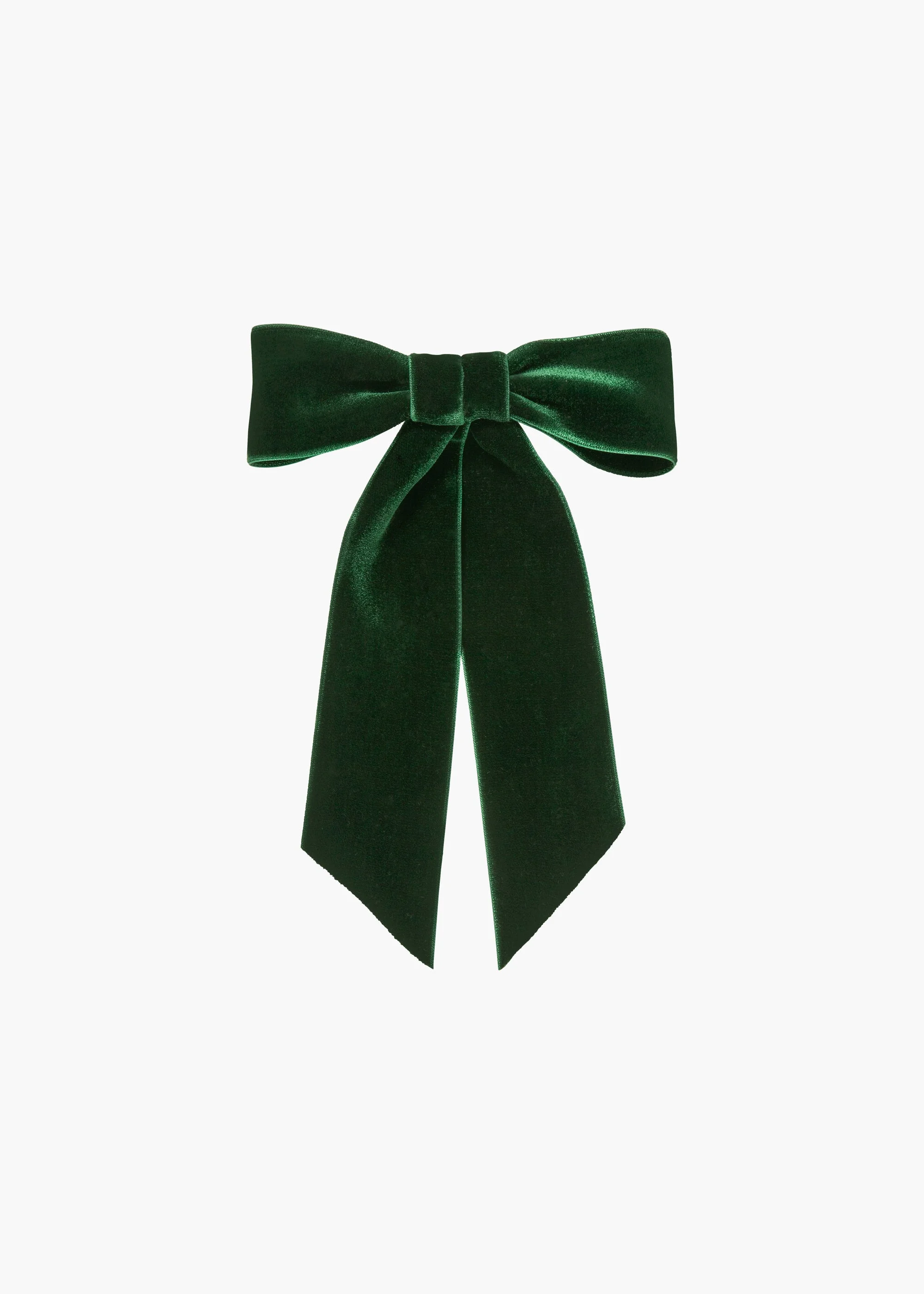 The Wide Velvet Bow Barrette is the larger sister of our classic Velvet Bow Barrette . Handmade in our Brooklyn studio, it features thick satin-edged silk velvet ribbon and a French barrette closure, making it easy to wear a multitude of ways, in any type of hair. This bow is a timeless addition to your hair collection. Dimensions: 6 x 9 inches Weight: 19g Material The Wide Velvet Bow Barrette is made by hand in New York of velvet ribbon with a steel French barrette closure. We recommend treating this bow as you would a piece of jewelry, and storing in the dust bag when not in use. Avoid contact with water, perfume, and other chemicals, including hairspray, which should be used before placement in the hair.