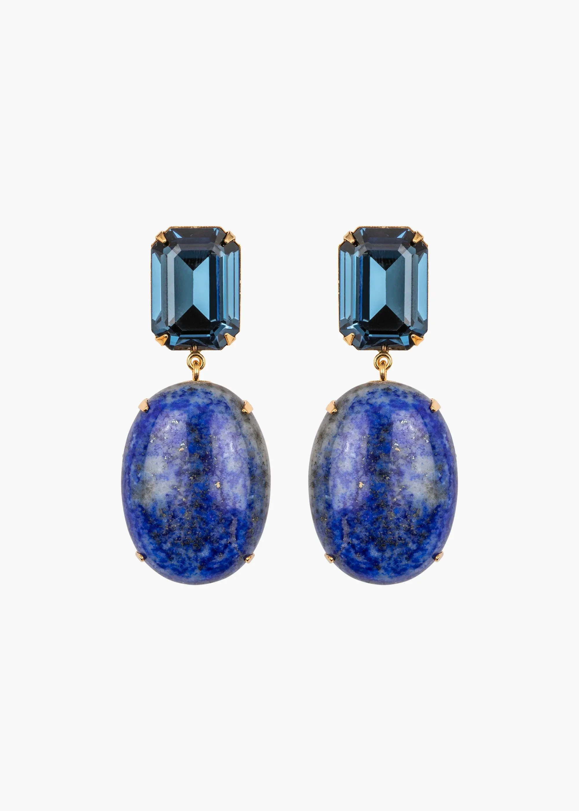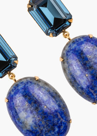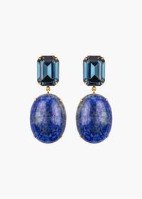 An incredibly memorable drop earring, the Xiomara Earrings are a celebration of natural semi-precious stones. Made by hand in New York in an 18-karat gold-plated setting, the cabochon gemstones (carnelian, tiger's eye, malachite or lapis lazuli) are large enough to highlight the idiosyncrasies that make each stone unique, from the variations in color to the veining, underscoring a pattern forged by nature. Standing in contrast to the organic beauty of the semi-precious material is a perfect emerald-cut Austrian crystal. Dimensions: 2in x 7/8in Material The Xiomara Earrings are made by hand in New York from 18K gold plated brass and Austrian crystals with natural semi-precious stone drops. All stones have natural variances in color and markings that make each one unique. They have a surgical-steel post, are nickel-free, and safe for sensitive skin. We recommend storing earrings in their dust bag while not in use, and avoiding contact with water, perfume, hairspray, and other chemicals.